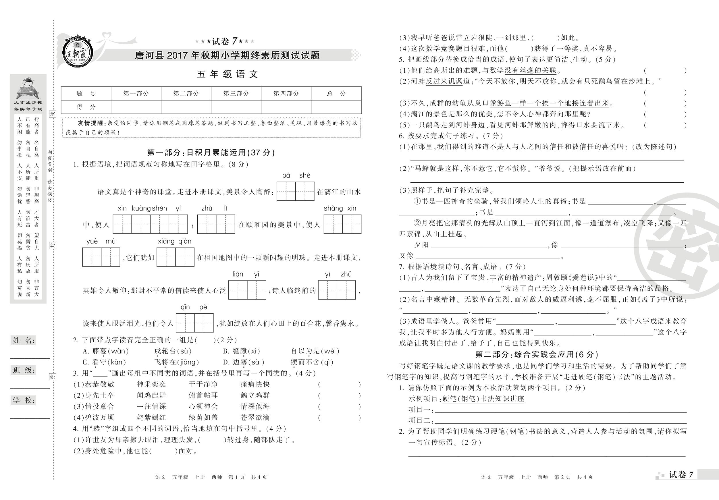 2017-2018学年第一学期南阳市唐河县五年级语文试卷(西师版)【7】