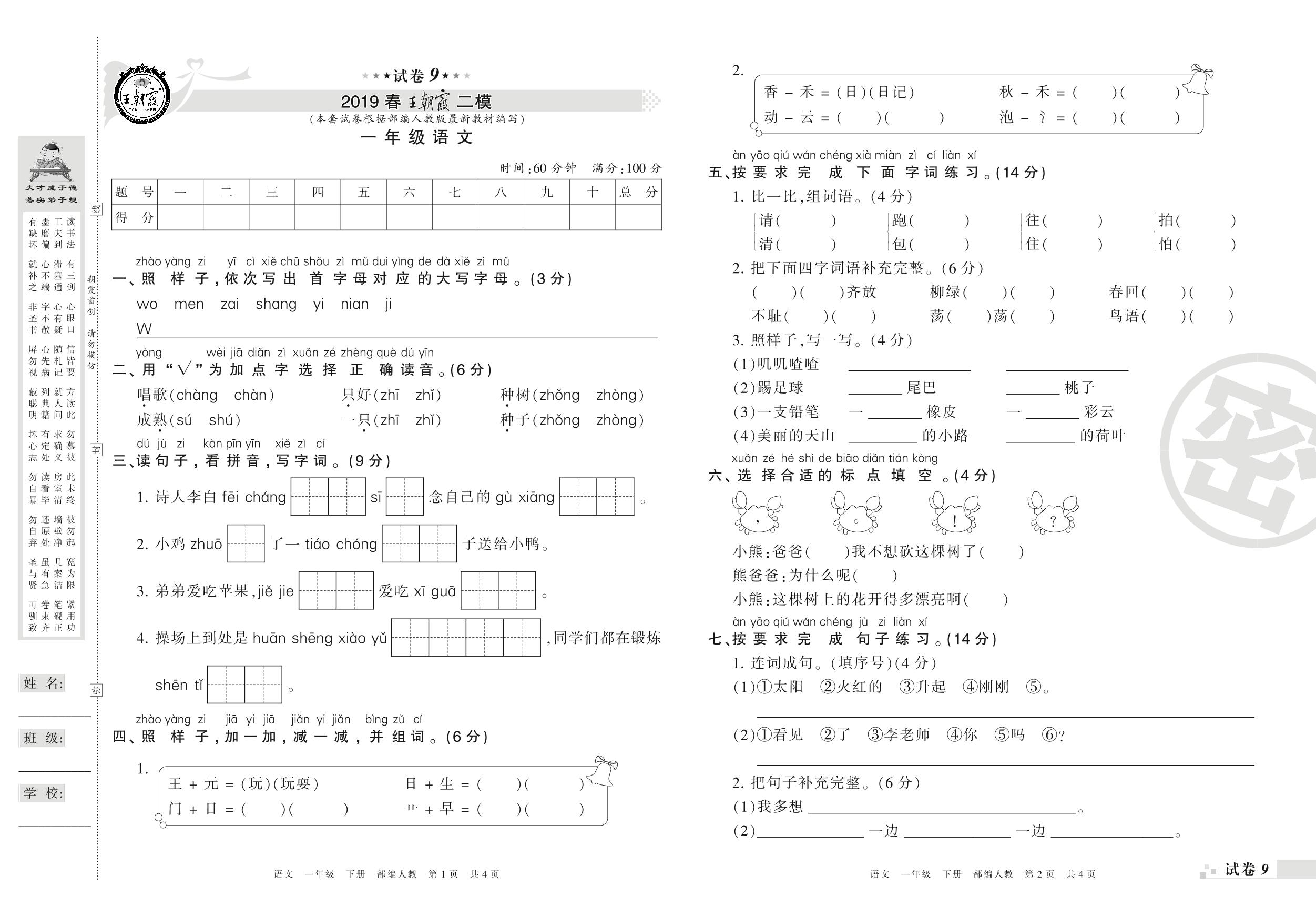 王朝霞期末模拟卷一年级下册语文(人教版)_R210731182402【9】