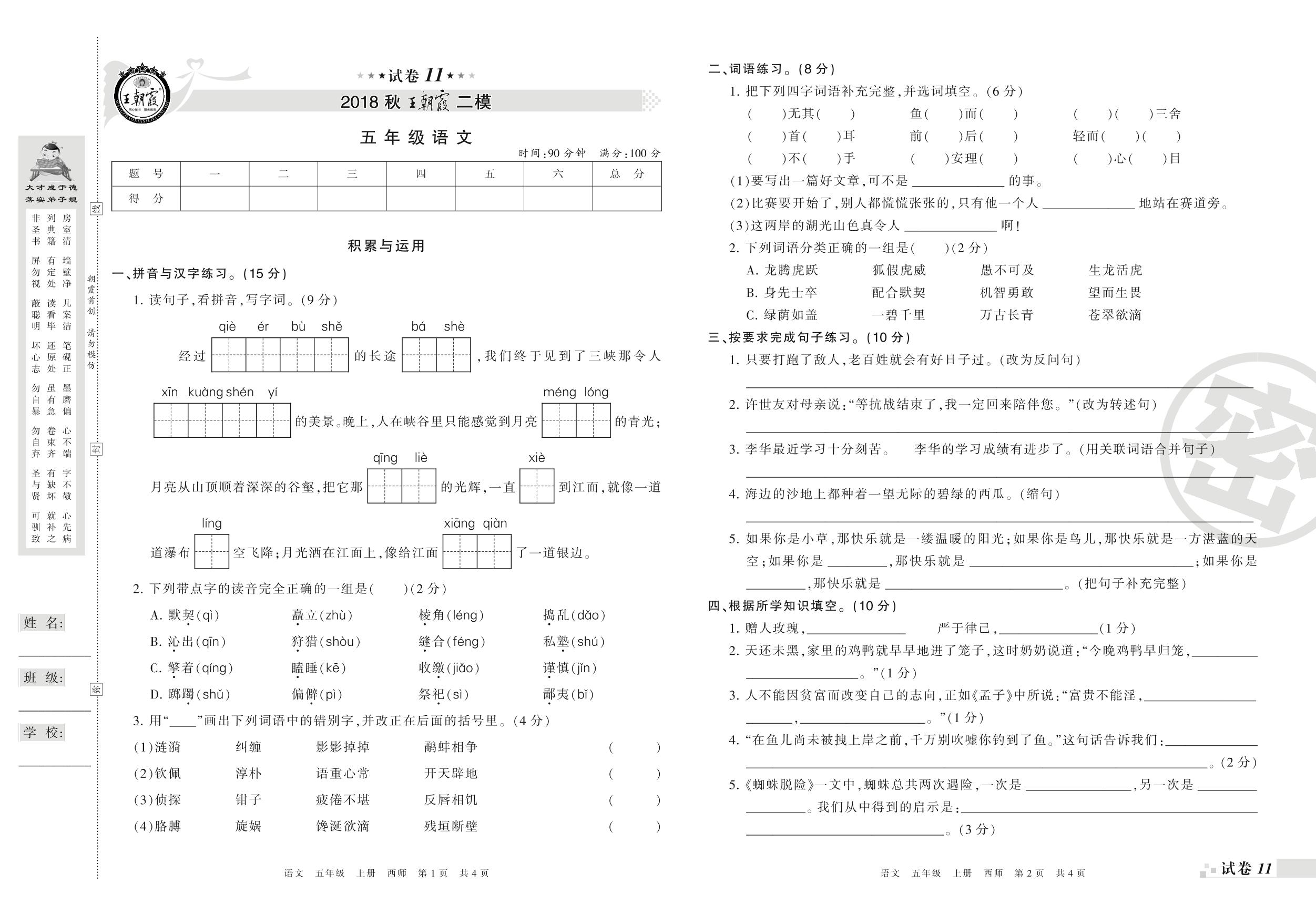 王朝霞期末模拟卷五年级上册语文(西师版)【11】