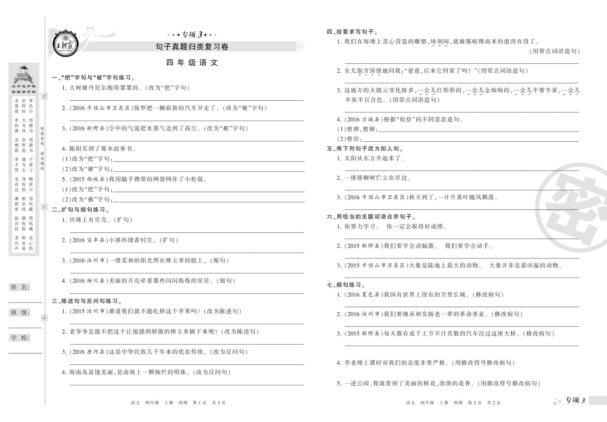 王朝霞期末专项卷——句子、课文内容真题归类复习四年级上册语文(西师版)【0】