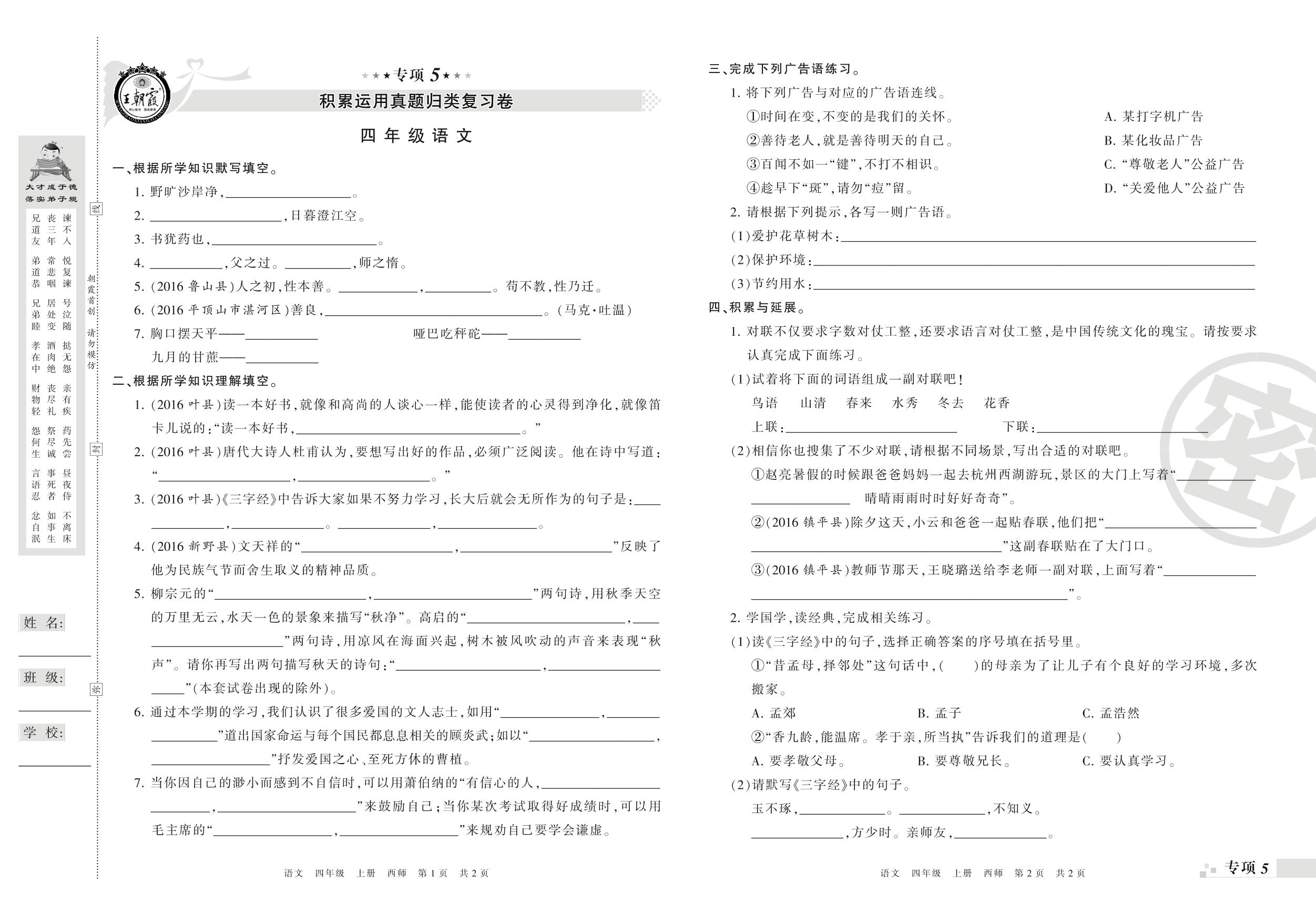 王朝霞期末专项卷——积累运用、课内阅读真题归类复习四年级上册语文(西师版)【0】