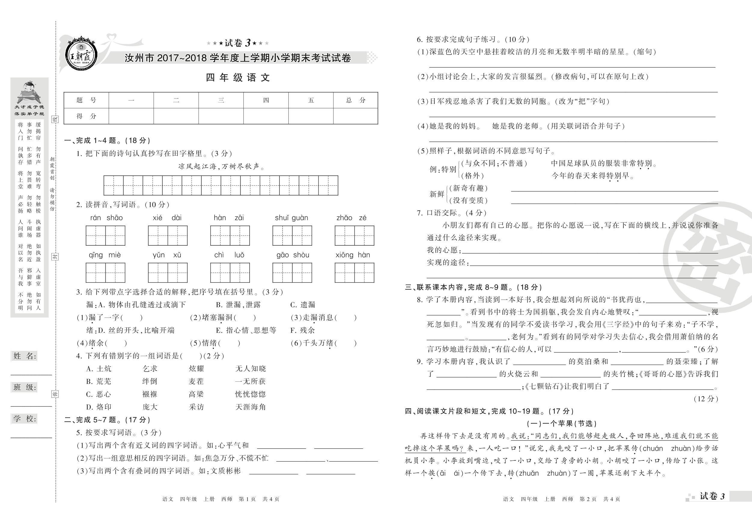 2017-2018学年第一学期汝州市四年级语文试卷(西师版)【3】