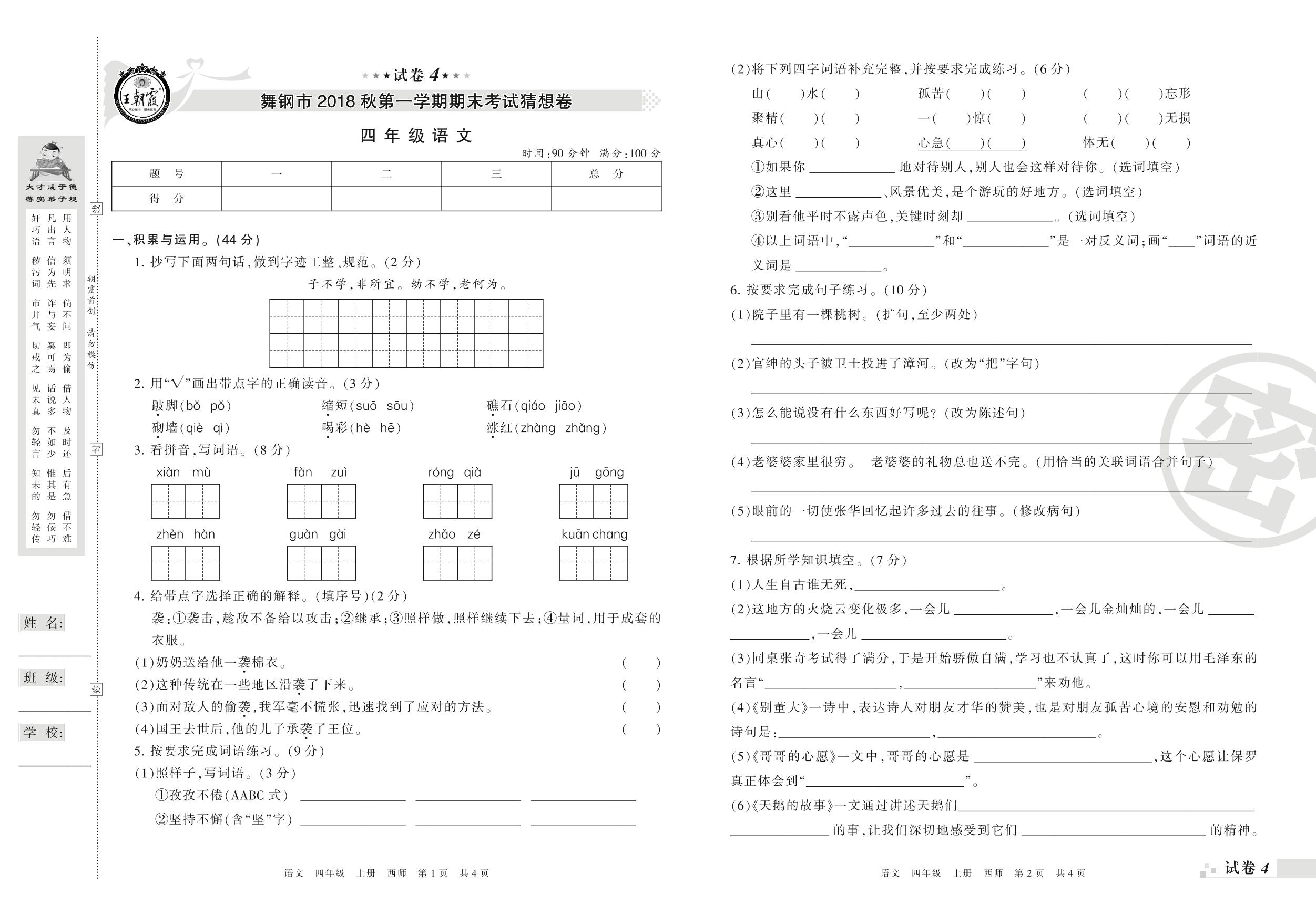 2018-2019学年第一学期舞钢市四年级语文试卷(西师版)【4】