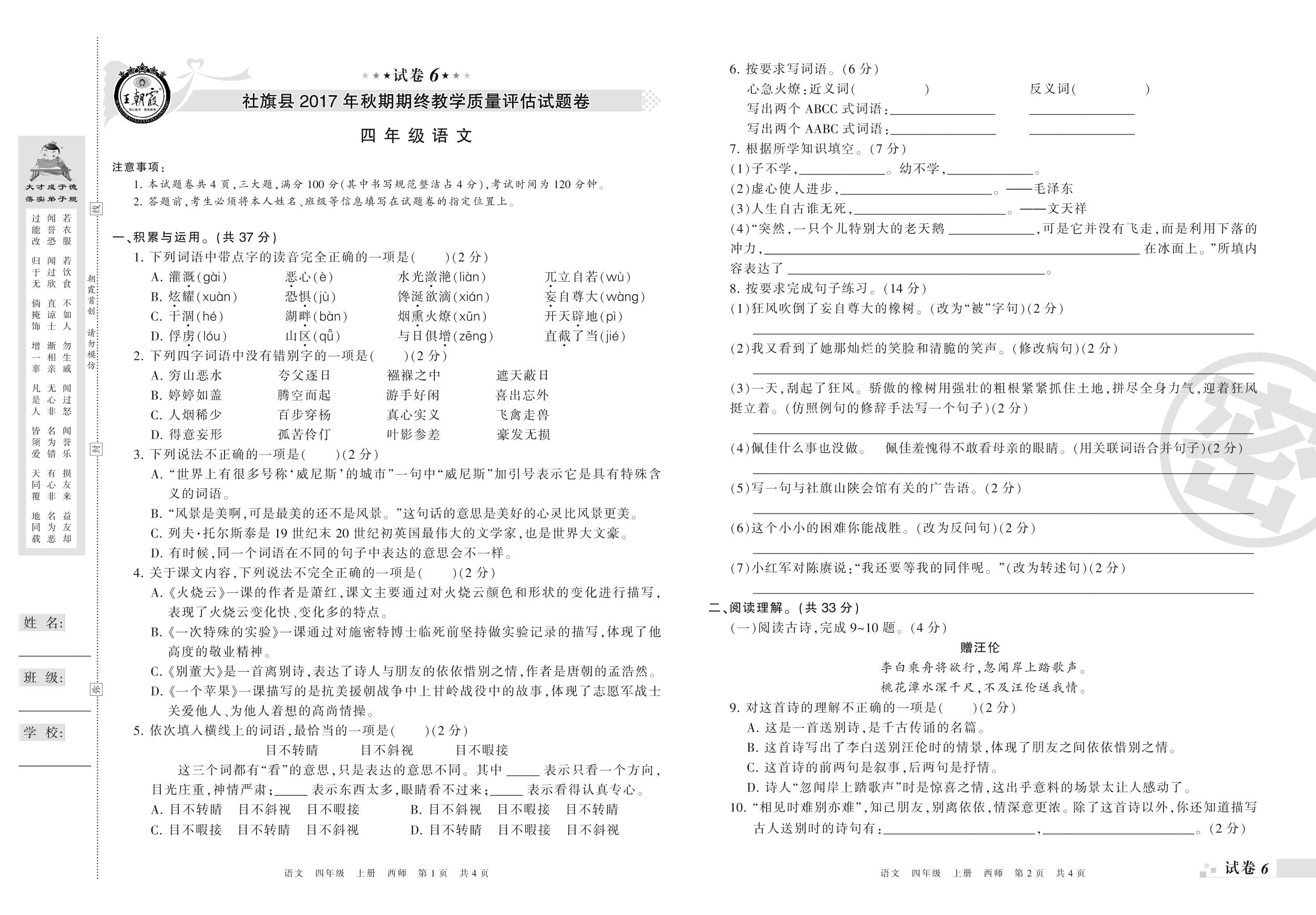 2017-2018学年第一学期南阳市社旗县四年级语文试卷(西师版)【6】