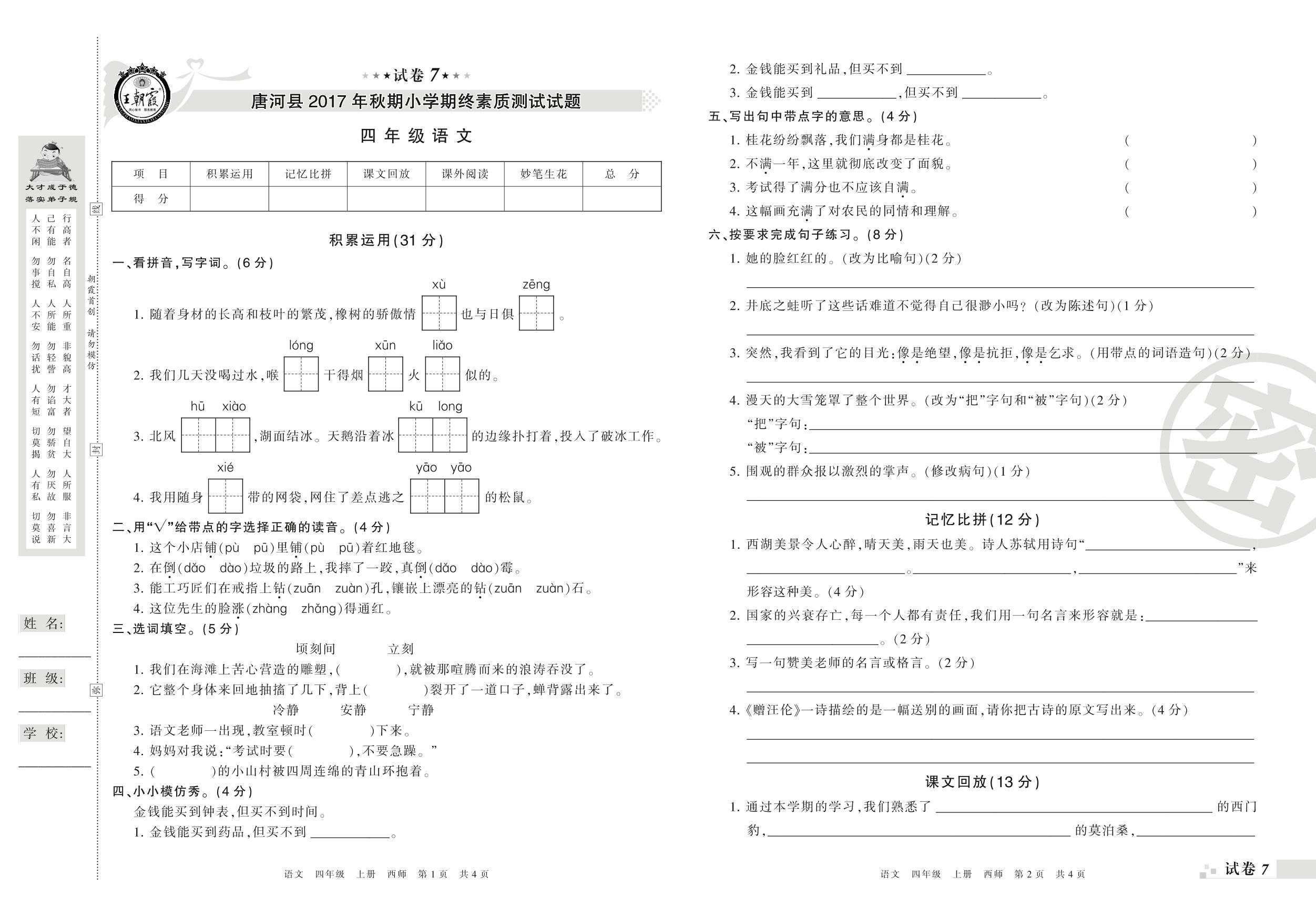 2017-2018学年第一学期南阳市唐河县四年级语文试卷(西师版)【7】
