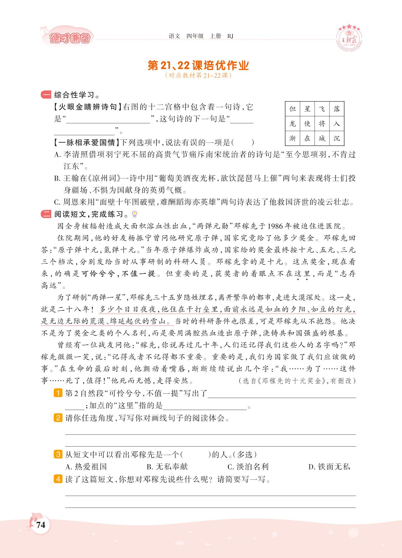 2021上册四年级语文人教版 第七单元——第21、22课培优作业