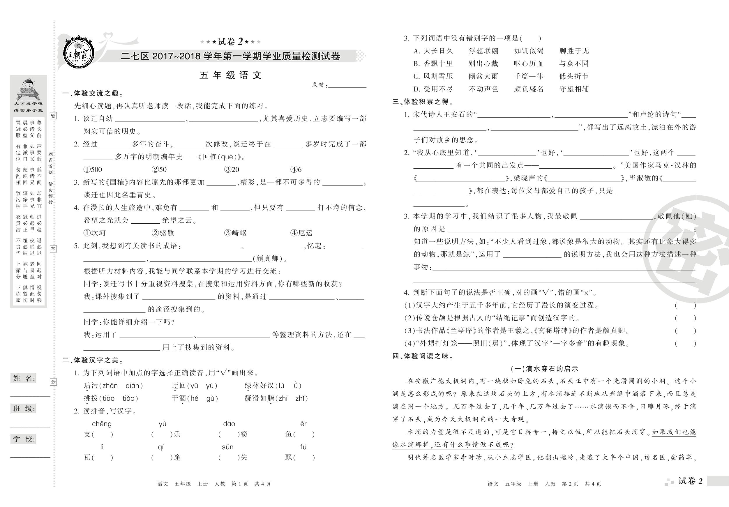 2017-2018学年第一学期郑州市二七区五年级语文试卷(人教版)【2】