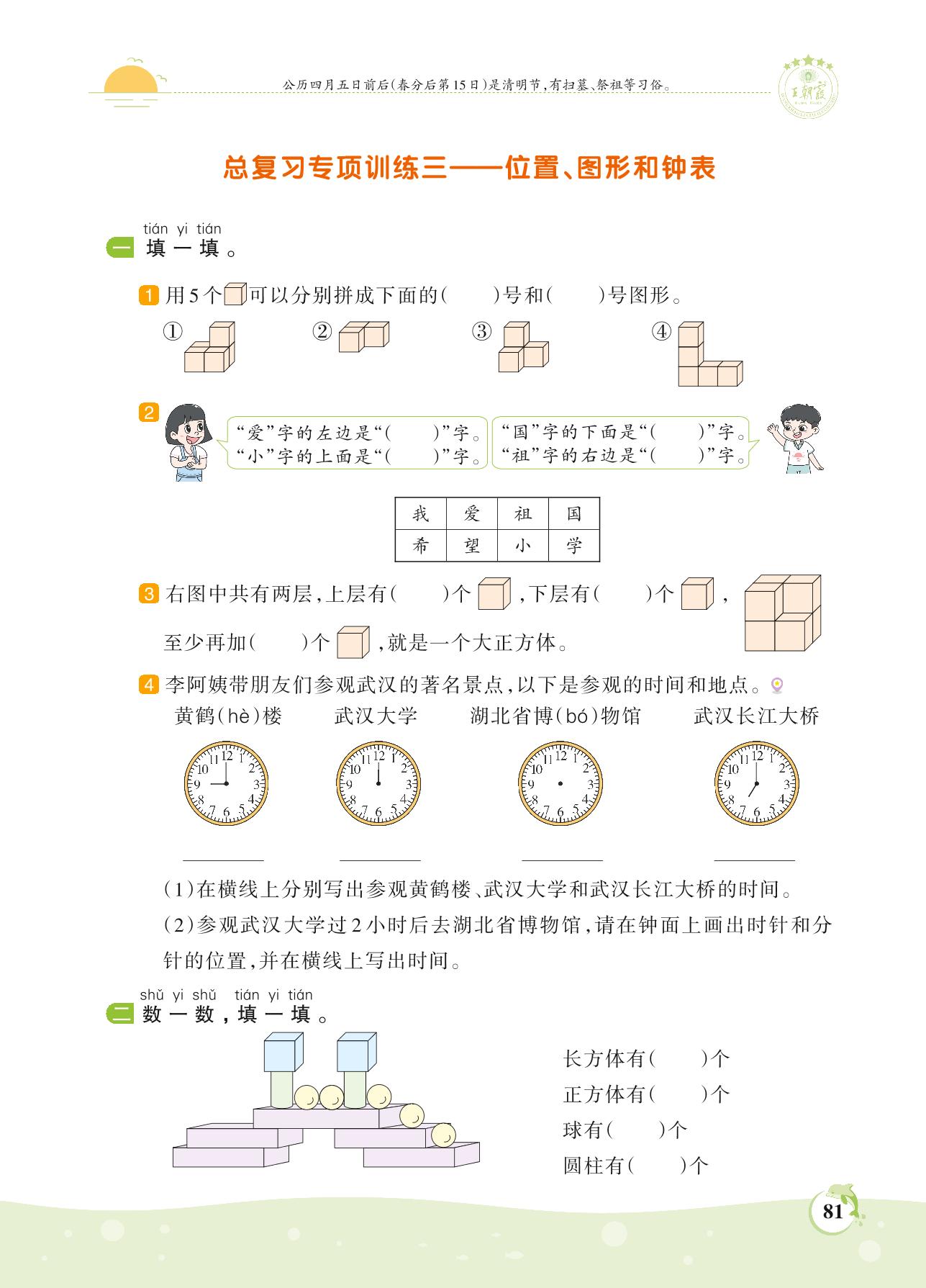 2021上册一年级数学人教版 第九单元 总复习——位置、图形和钟表