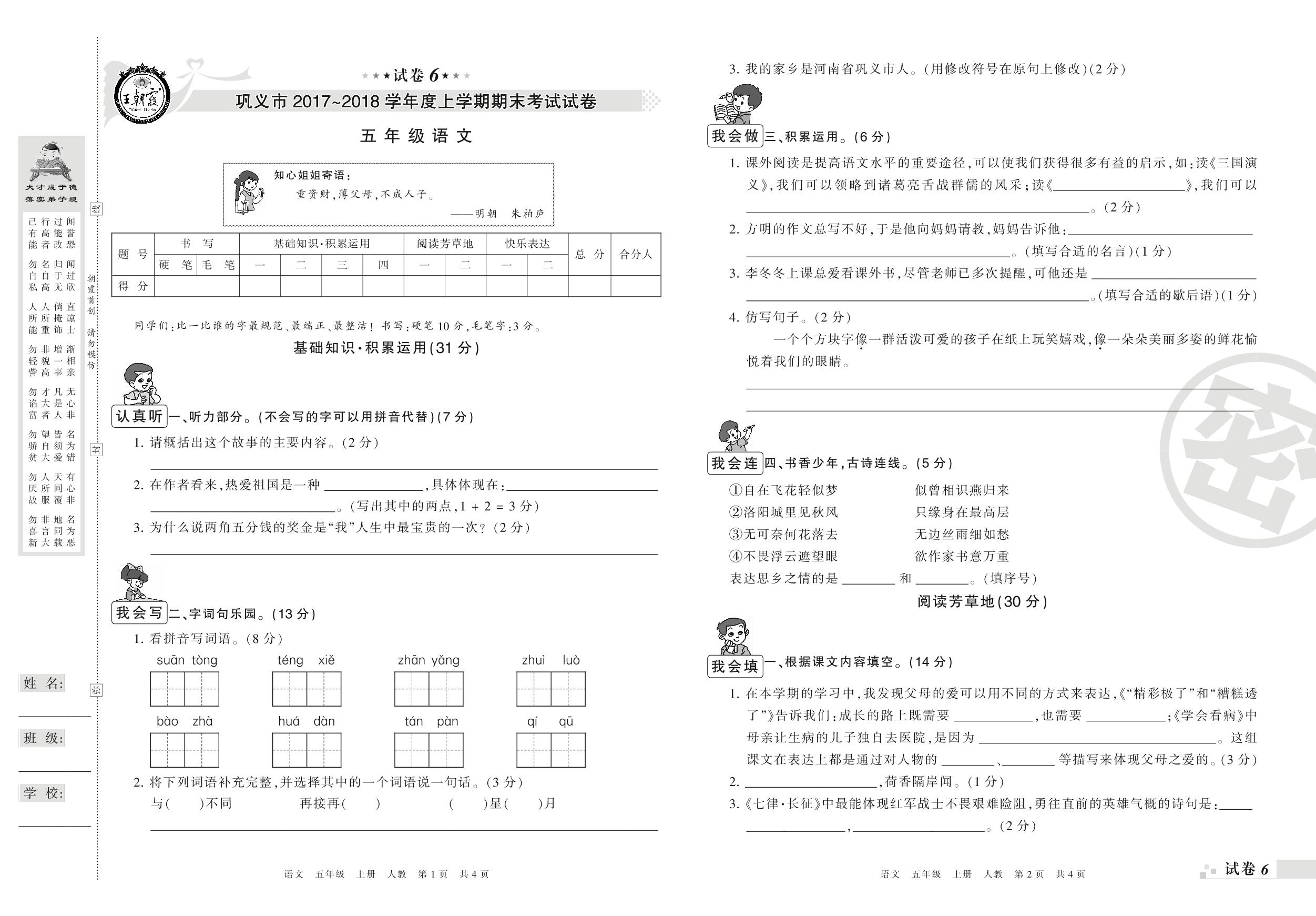 2017-2018学年第一学期巩义市五年级语文试卷(人教版)【6】