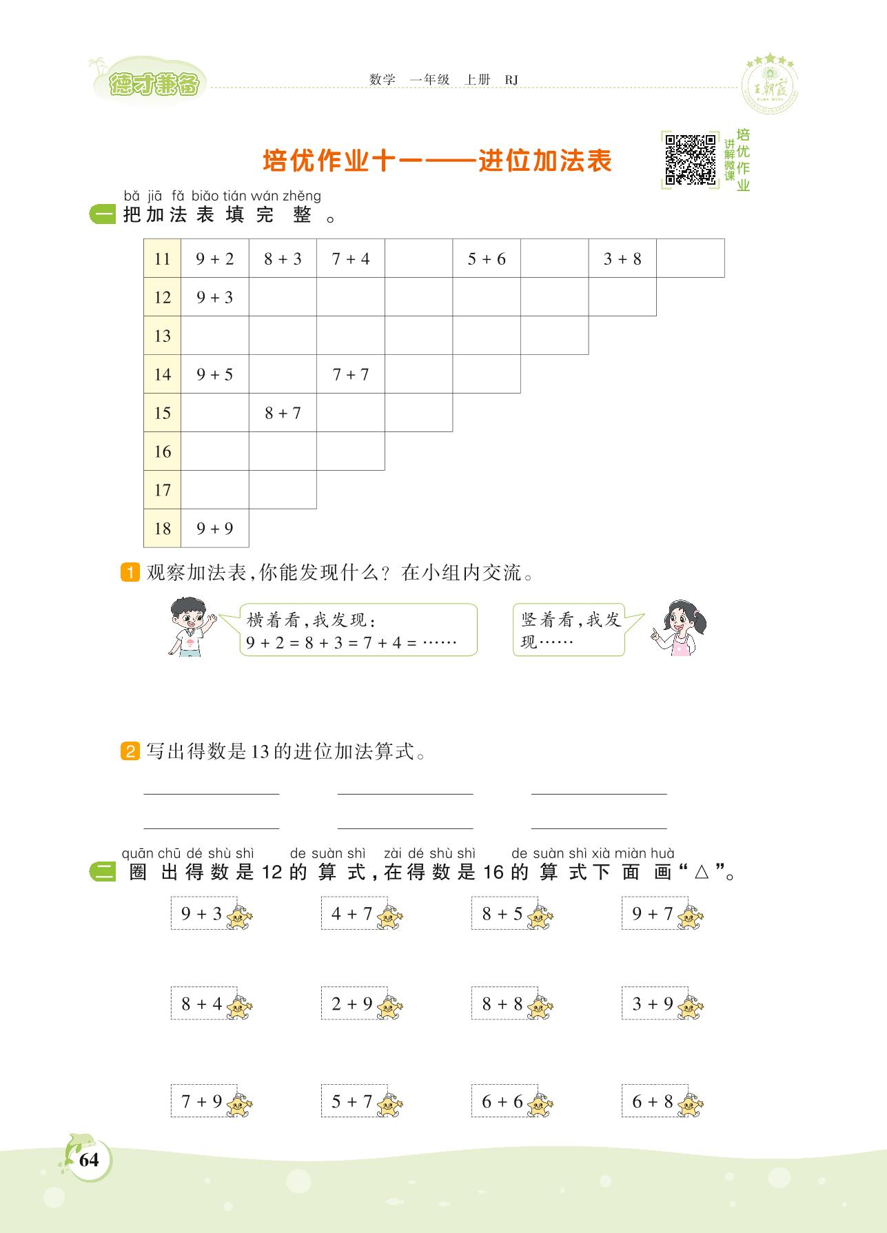 2021上册一年级数学人教版 第八单元 25以内的进位加法——培优作业十一——进位加法表