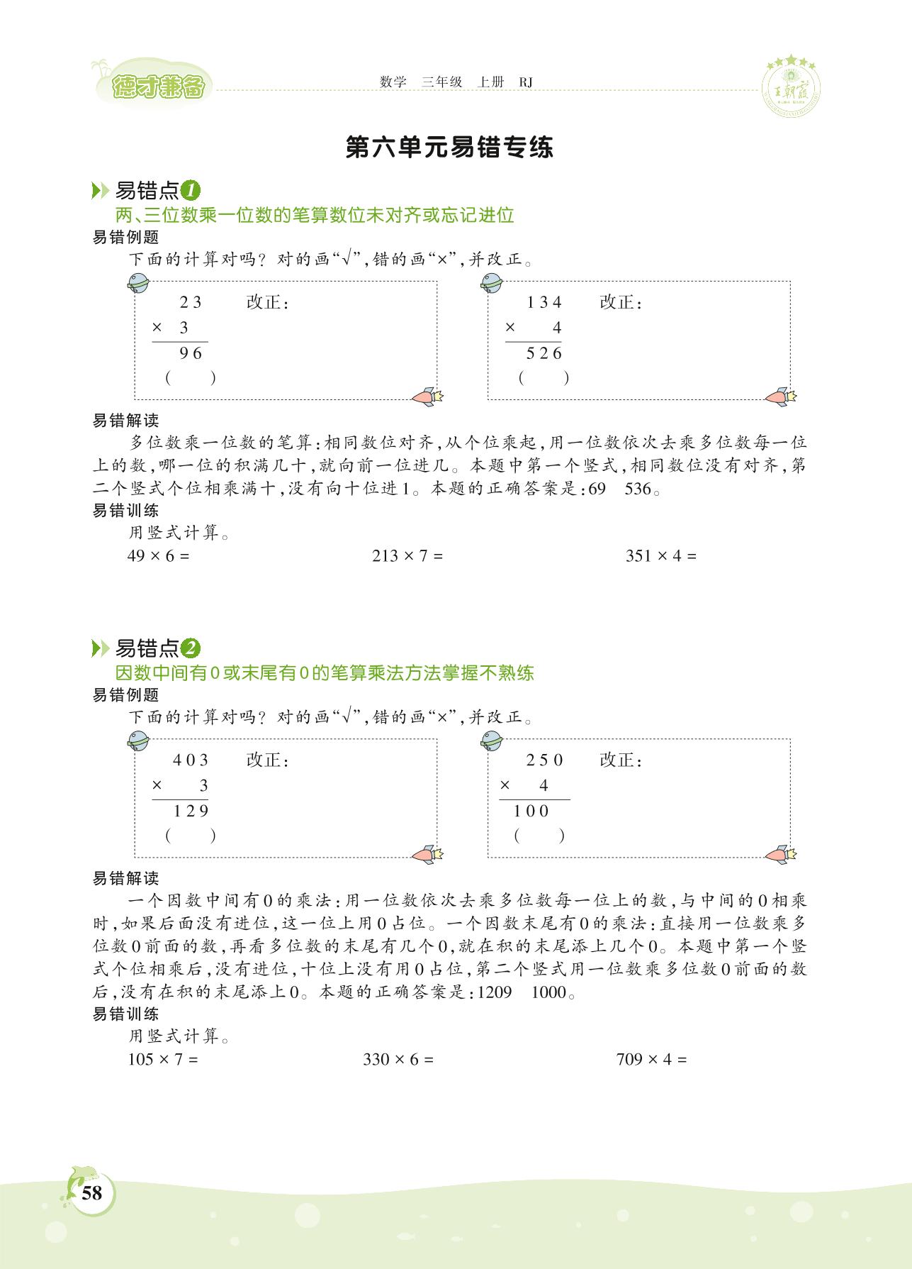 2021上册三年级数学人教版 第六单元 多位数乘一位数——第六单元易错专练