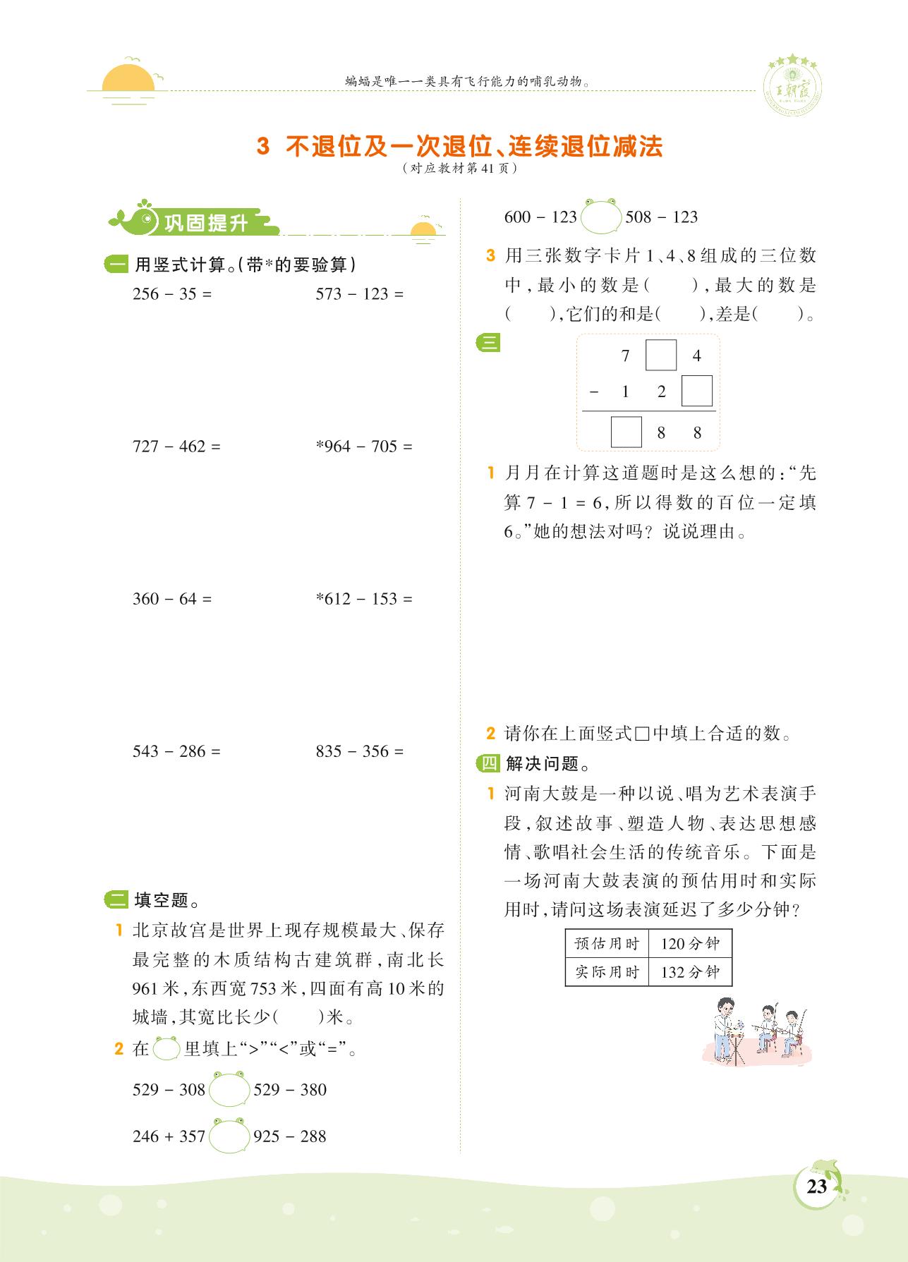2021上册三年级数学人教版 第四单元 万以内的加法和减法(二)——3 不退位及一次退位、连续退位减法