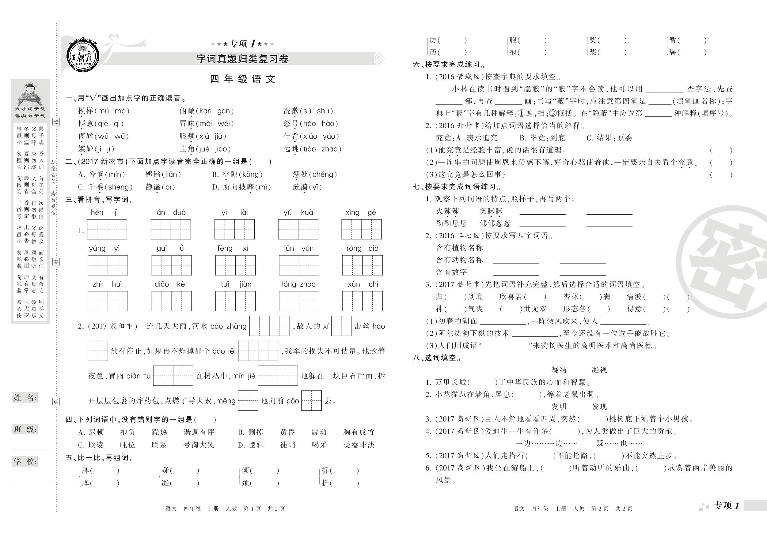 王朝霞期末专项卷——字词、句子真题归类复习四年级上册语文(人教版)_R210801222913【0】