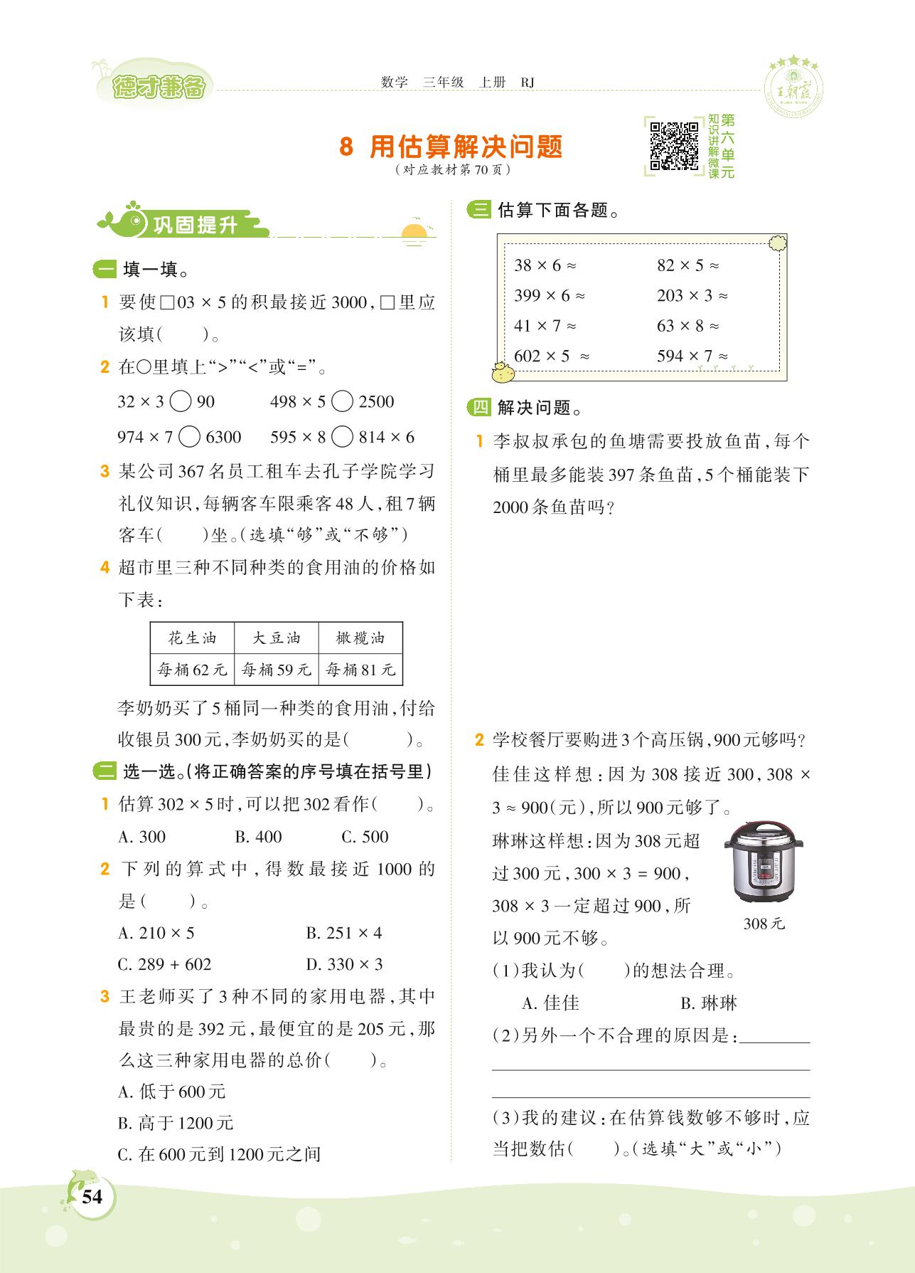 2021上册三年级数学人教版 第六单元 多位数乘一位数——8 用估算解决问题