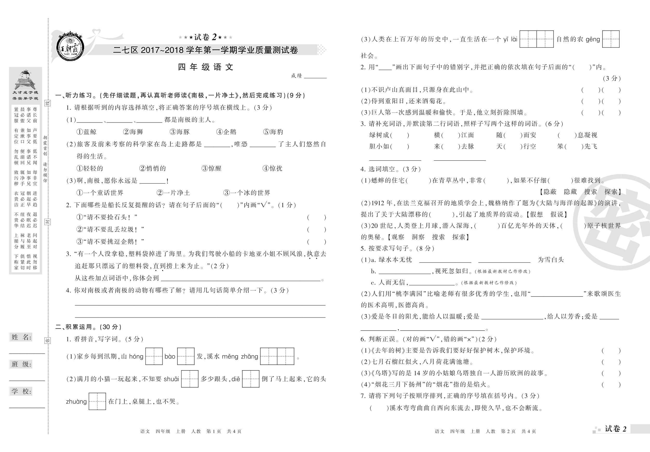 2017-2018学年第一学期郑州市二七区四年级语文试卷(人教版)【2】