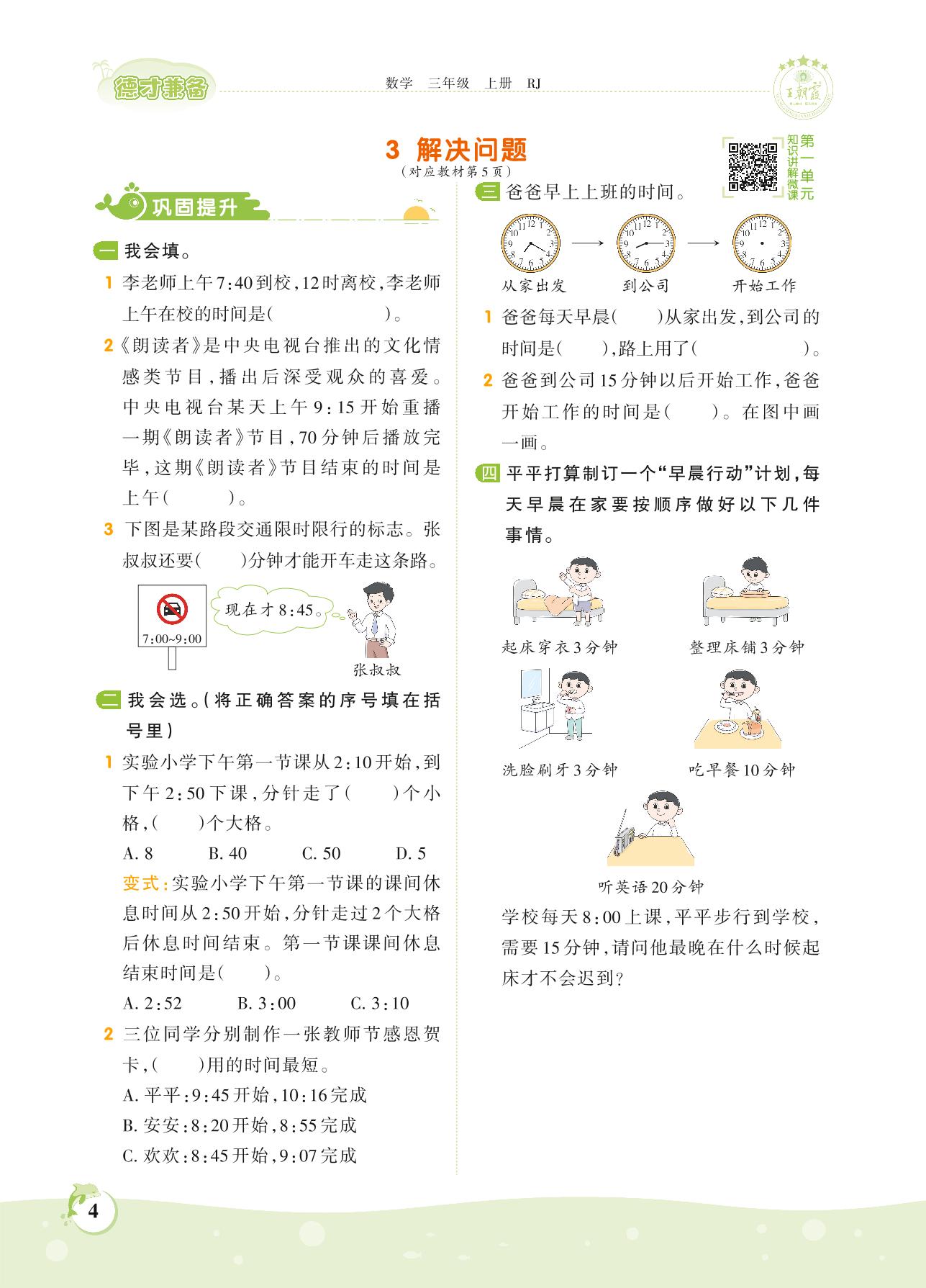2021上册三年级数学人教版 第一单元 时、分、秒——3 解决问题