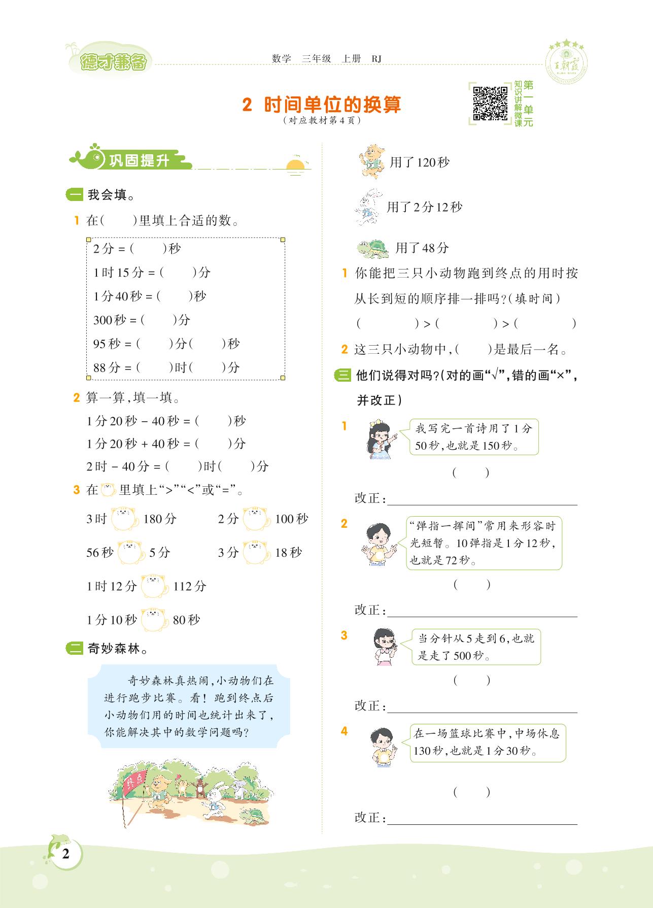 2021上册三年级数学人教版 第一单元 时、分、秒——2 时间单位的换算