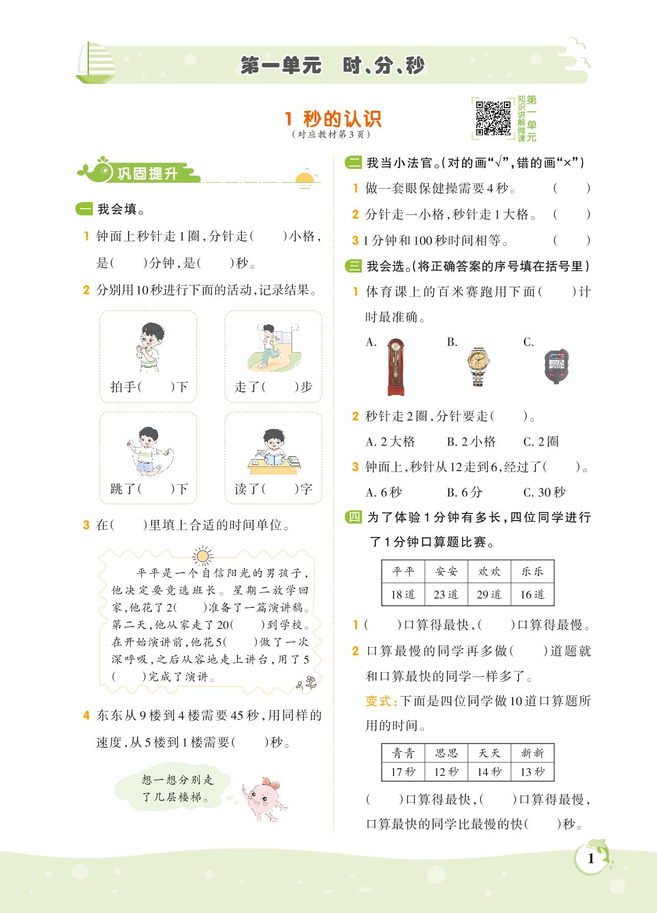 2021上册三年级数学人教版 第一单元 时、分、秒——1 秒的认识