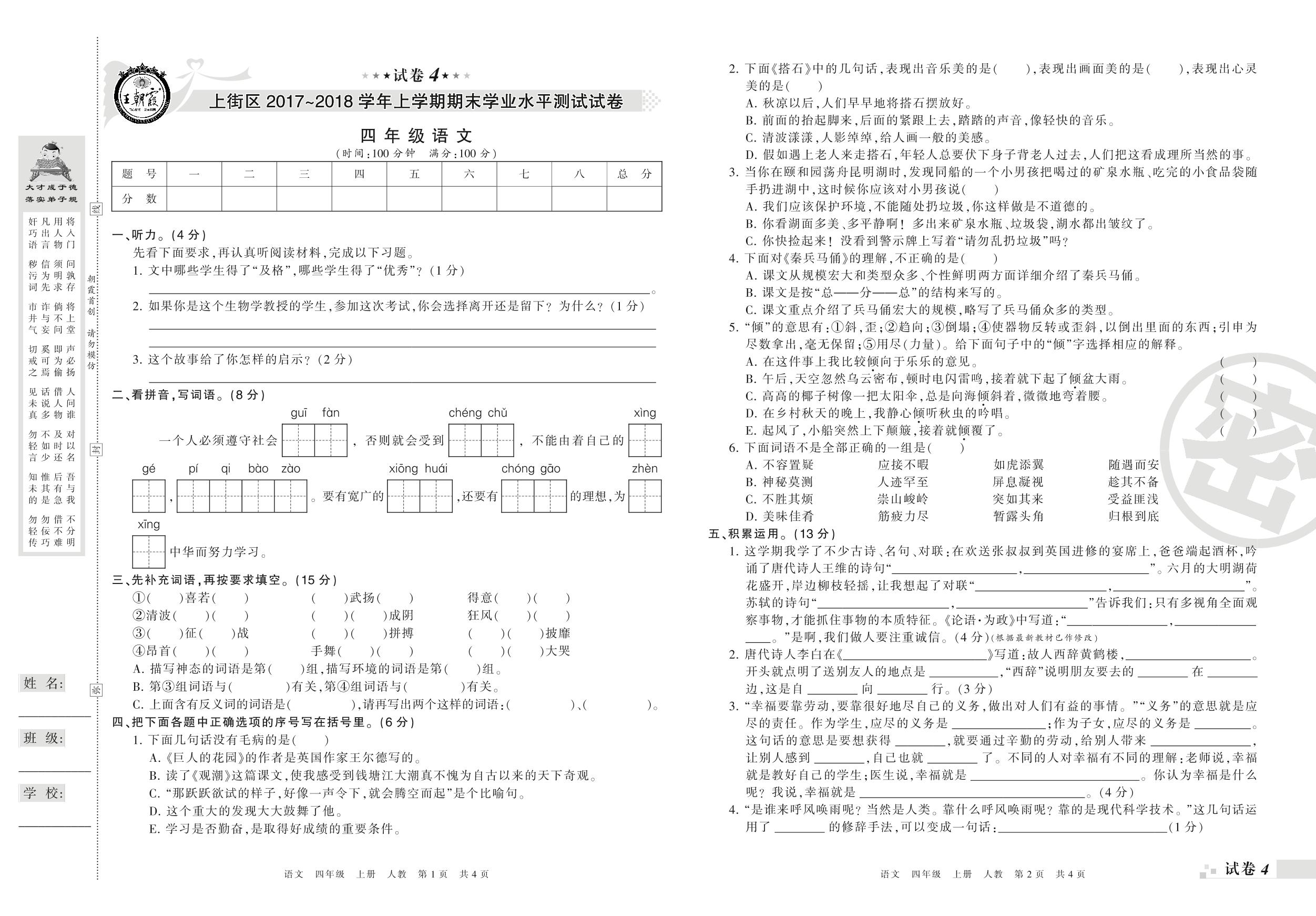 2017-2018学年第一学期郑州市上街区四年级语文试卷(人教版)【4】
