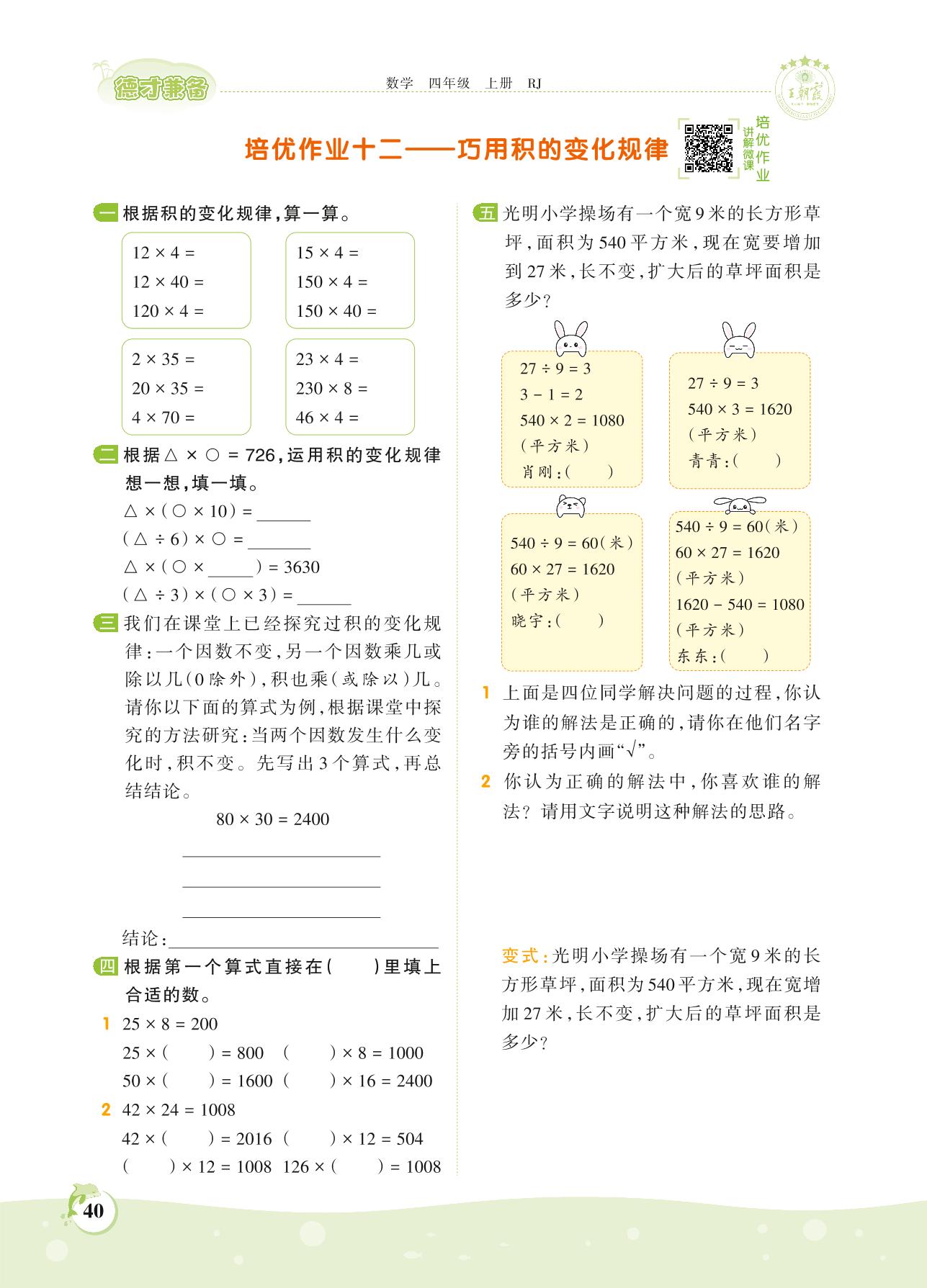 2021上册四年级数学人教版 第四单元 三位数乘两位数——培优作业十二 巧用积的变化规律
