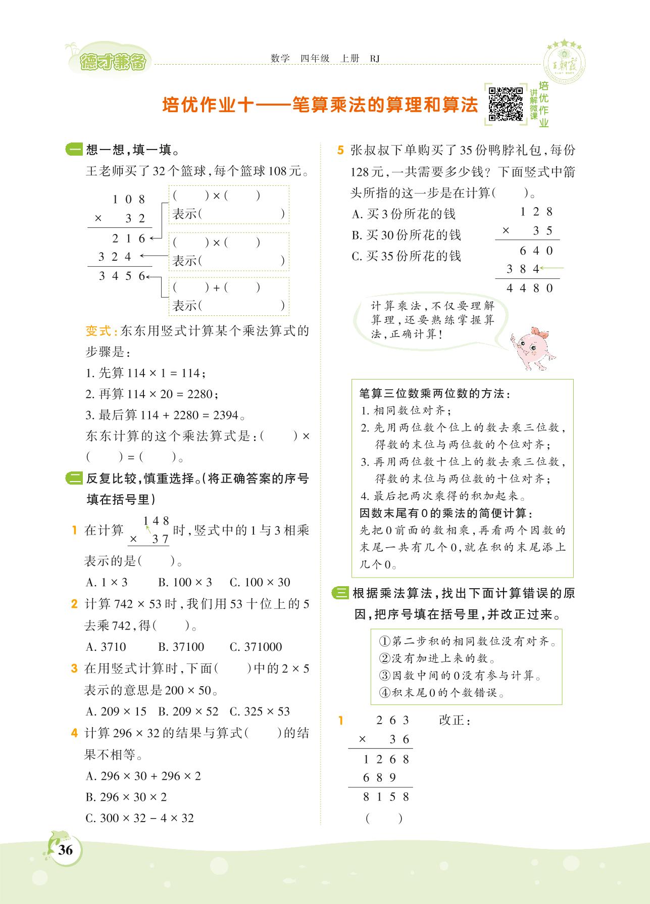 2021上册四年级数学人教版 第四单元 三位数乘两位数——培优作业十 笔算乘法的算理和算法