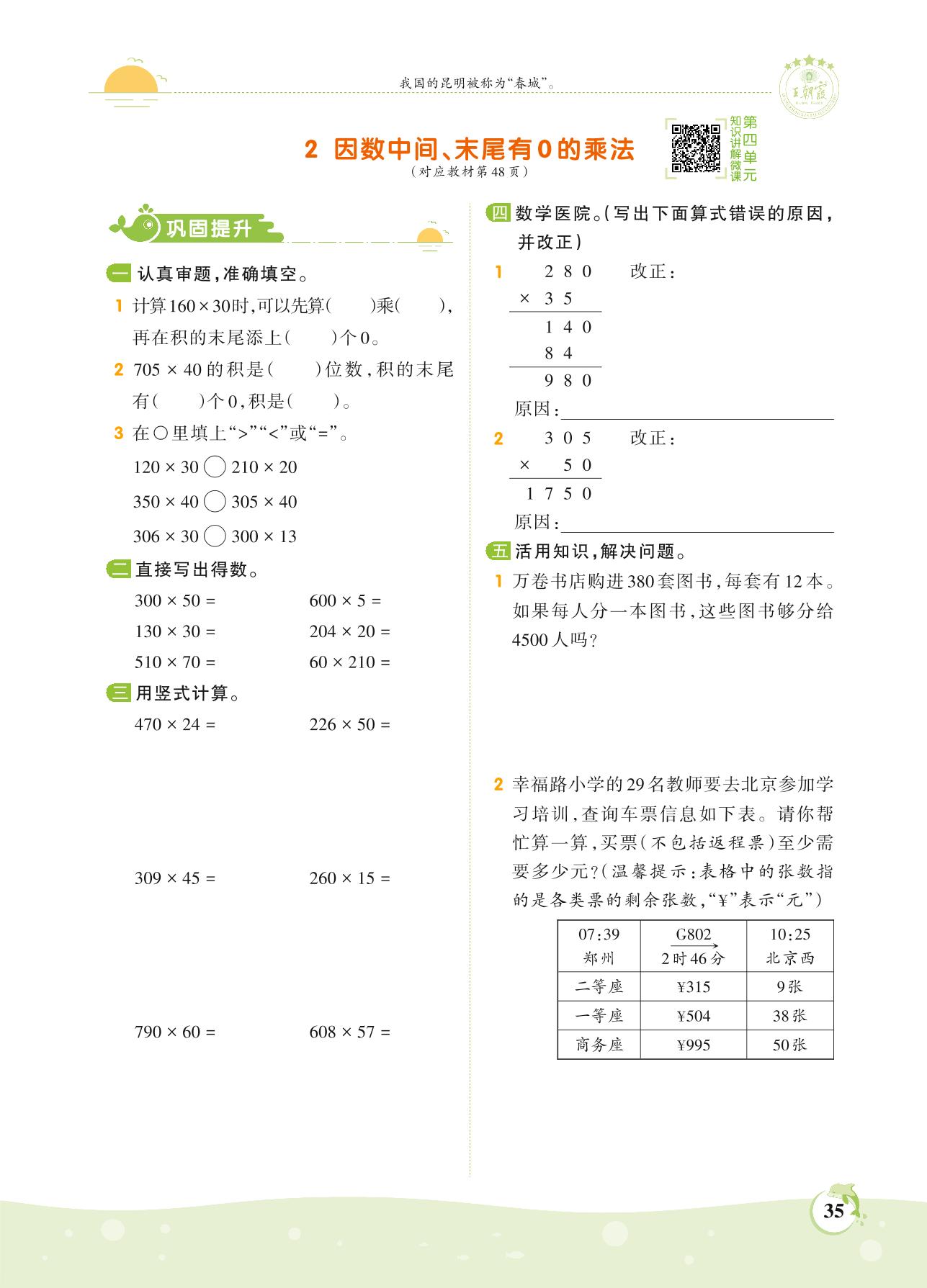 2021上册四年级数学人教版 第四单元 三位数乘两位数——2 因数中间、末尾有0的乘法