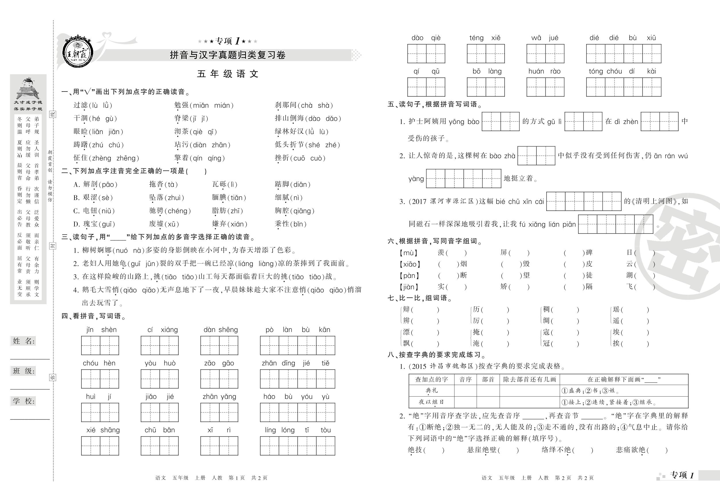 王朝霞期末专项卷——拼音与汉字、词语真题归类复习五年级上册语文(人教版)_R210801223041【0】