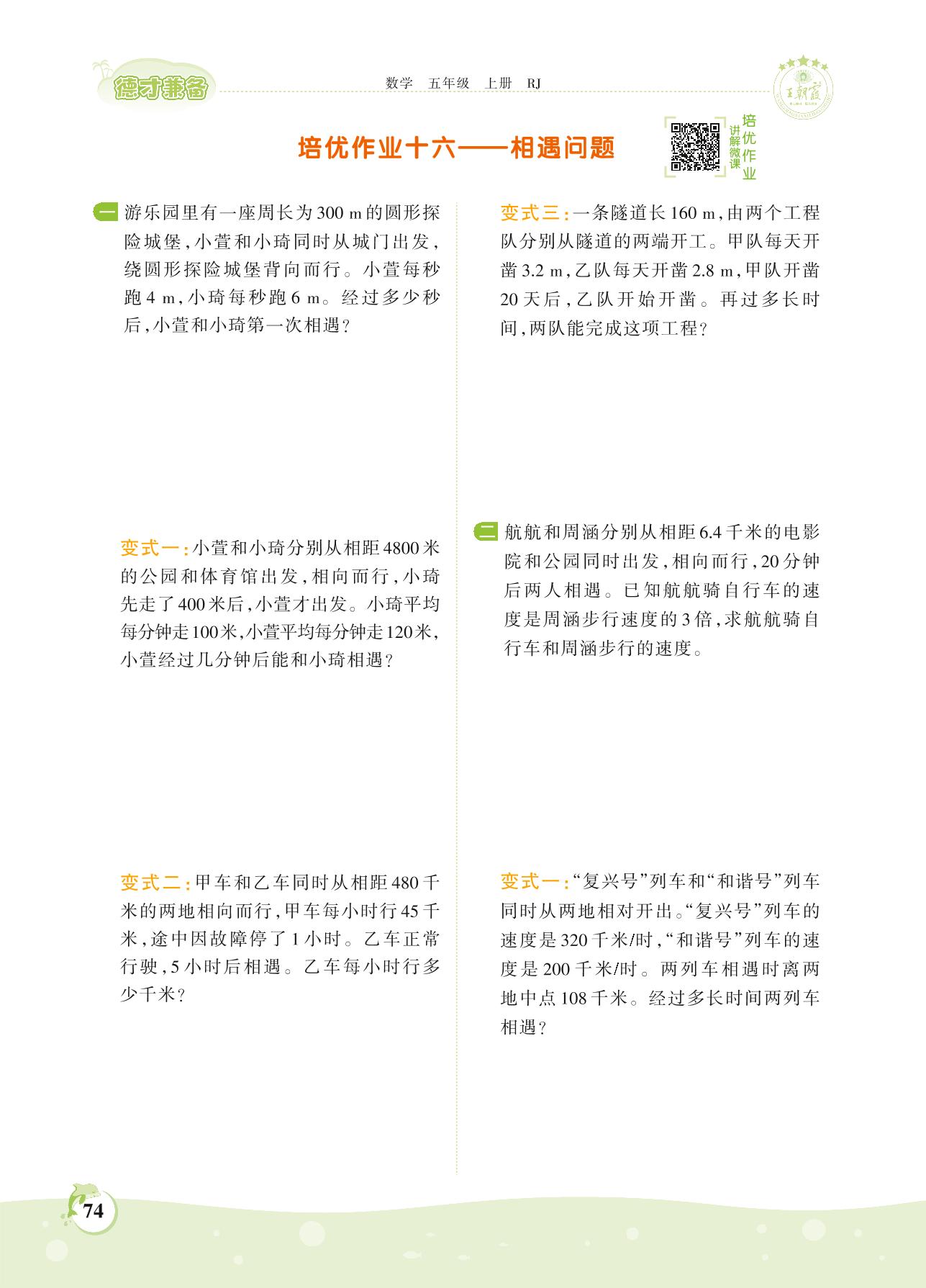 2021上册五年级数学人教版 第五单元 简易方程——培优作业十六 相遇问题