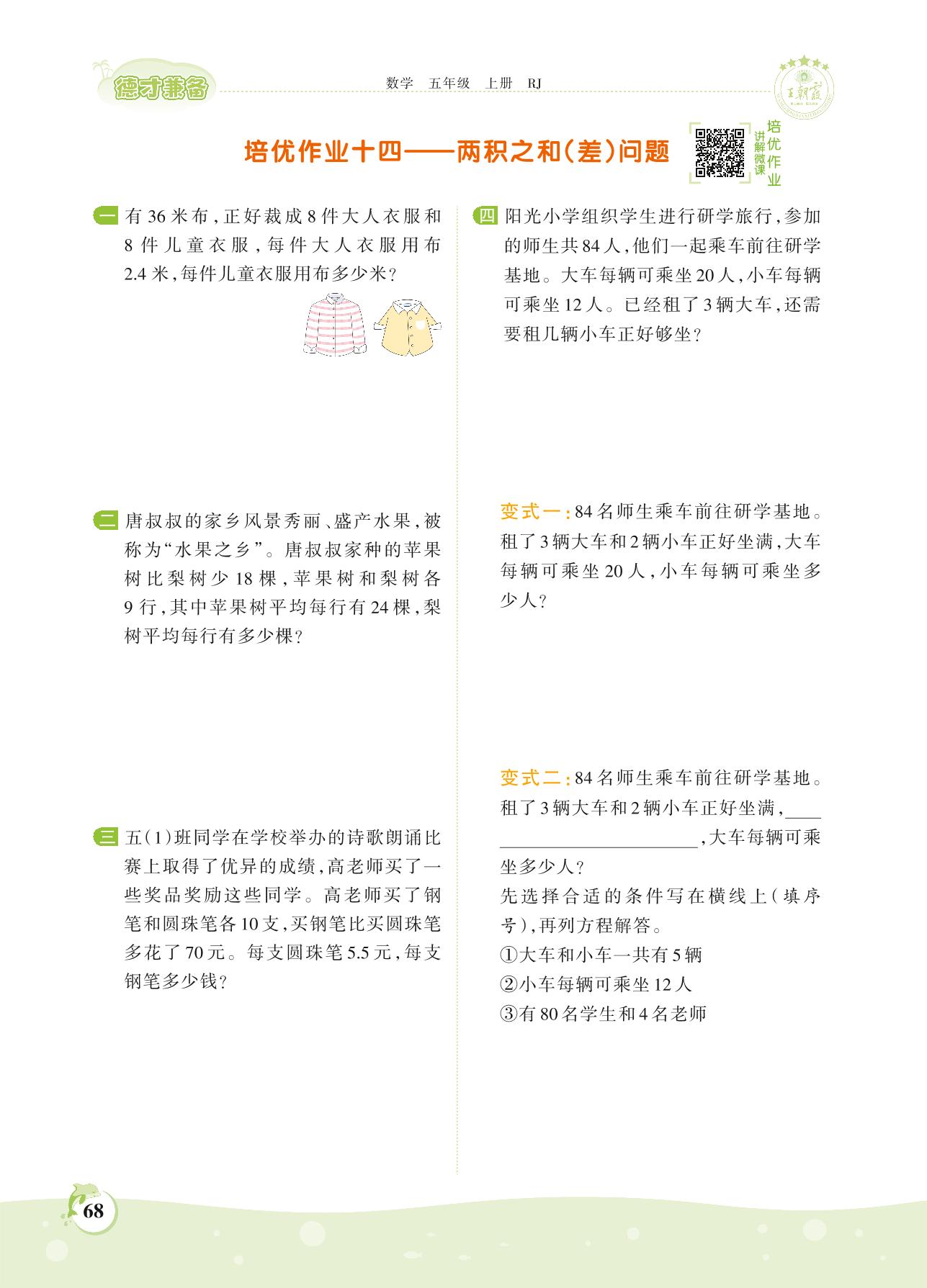 2021上册五年级数学人教版 第五单元 简易方程——培优作业十四 两积之和(差)问题