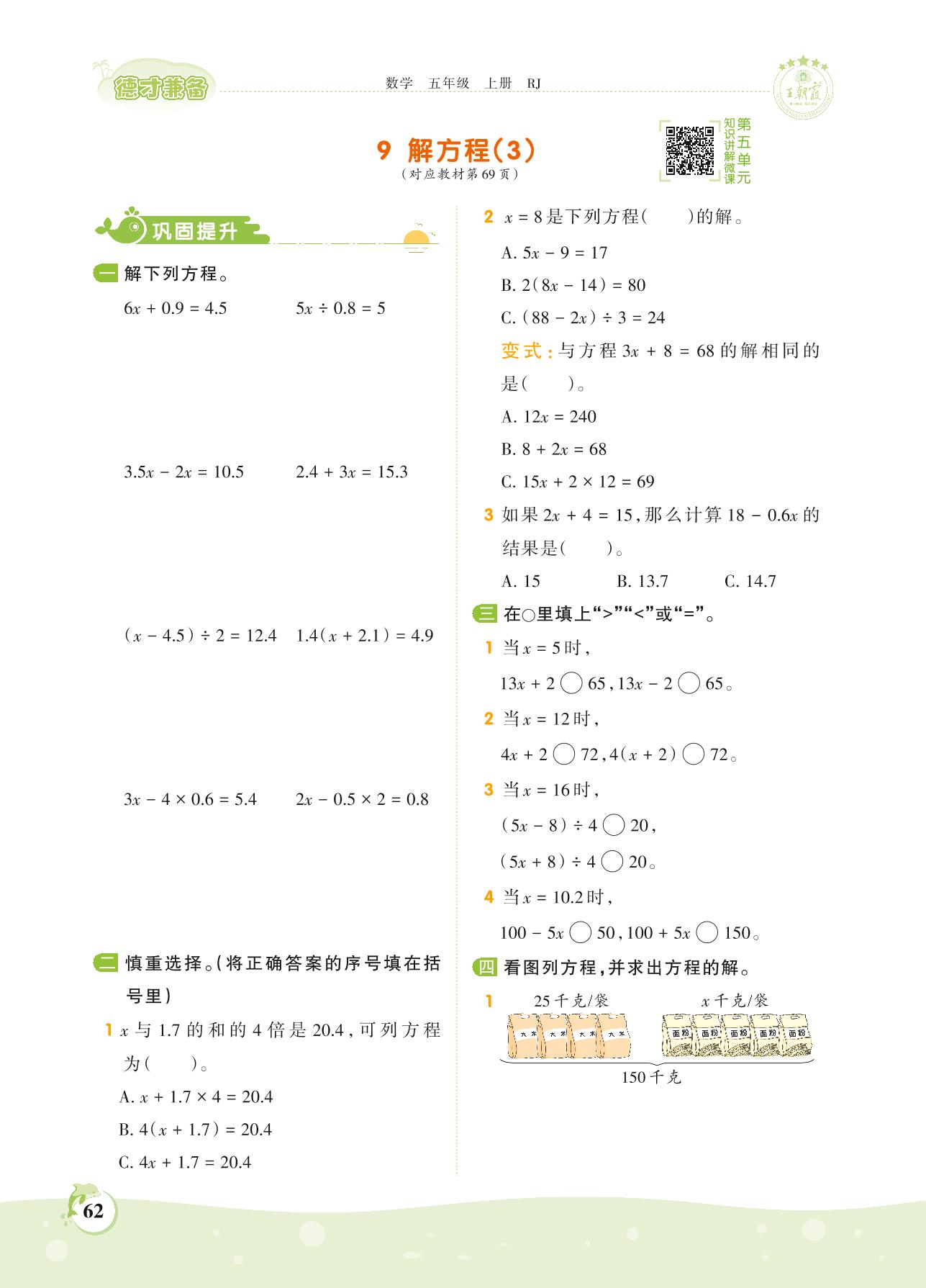 2021上册五年级数学人教版 第五单元 简易方程——9 解方程(3)