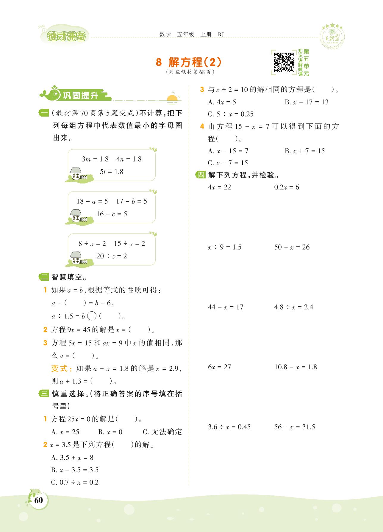 2021上册五年级数学人教版 第五单元 简易方程——8 解方程(2)