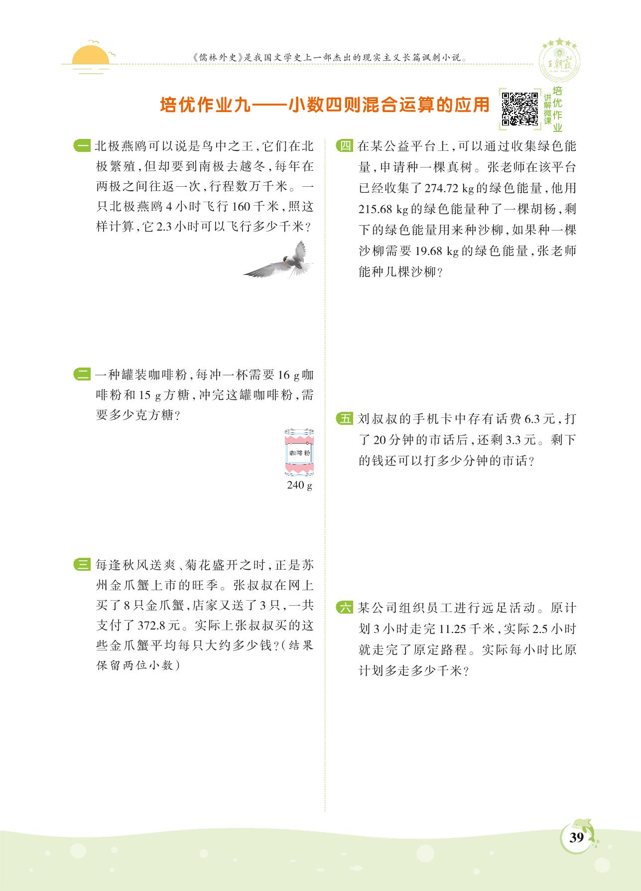 2021上册五年级数学人教版 第三单元 小数除法——培优作业九 小数四则混合运算的应用