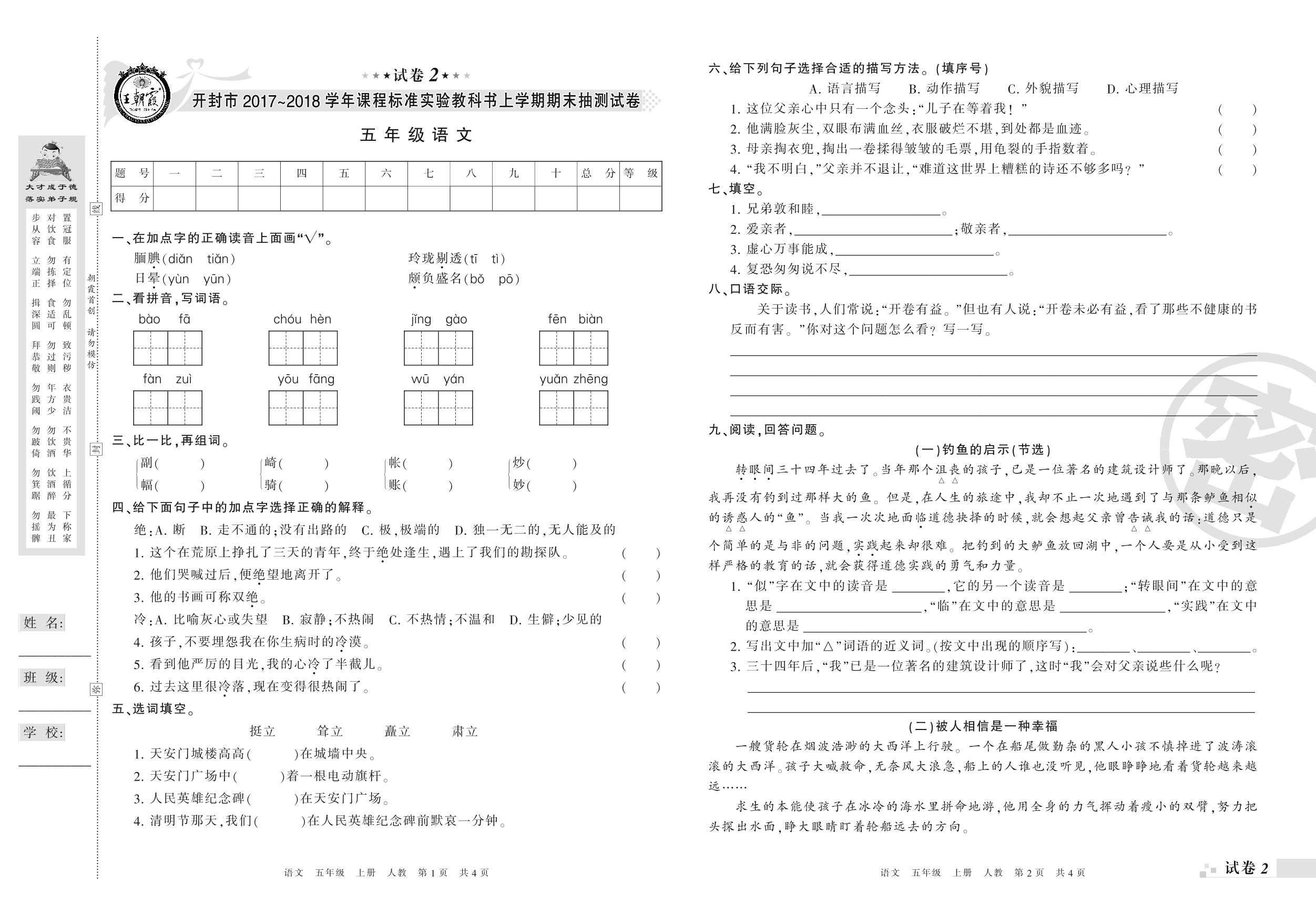 2017-2018学年第一学期开封市五年级语文试卷(人教版)【2】