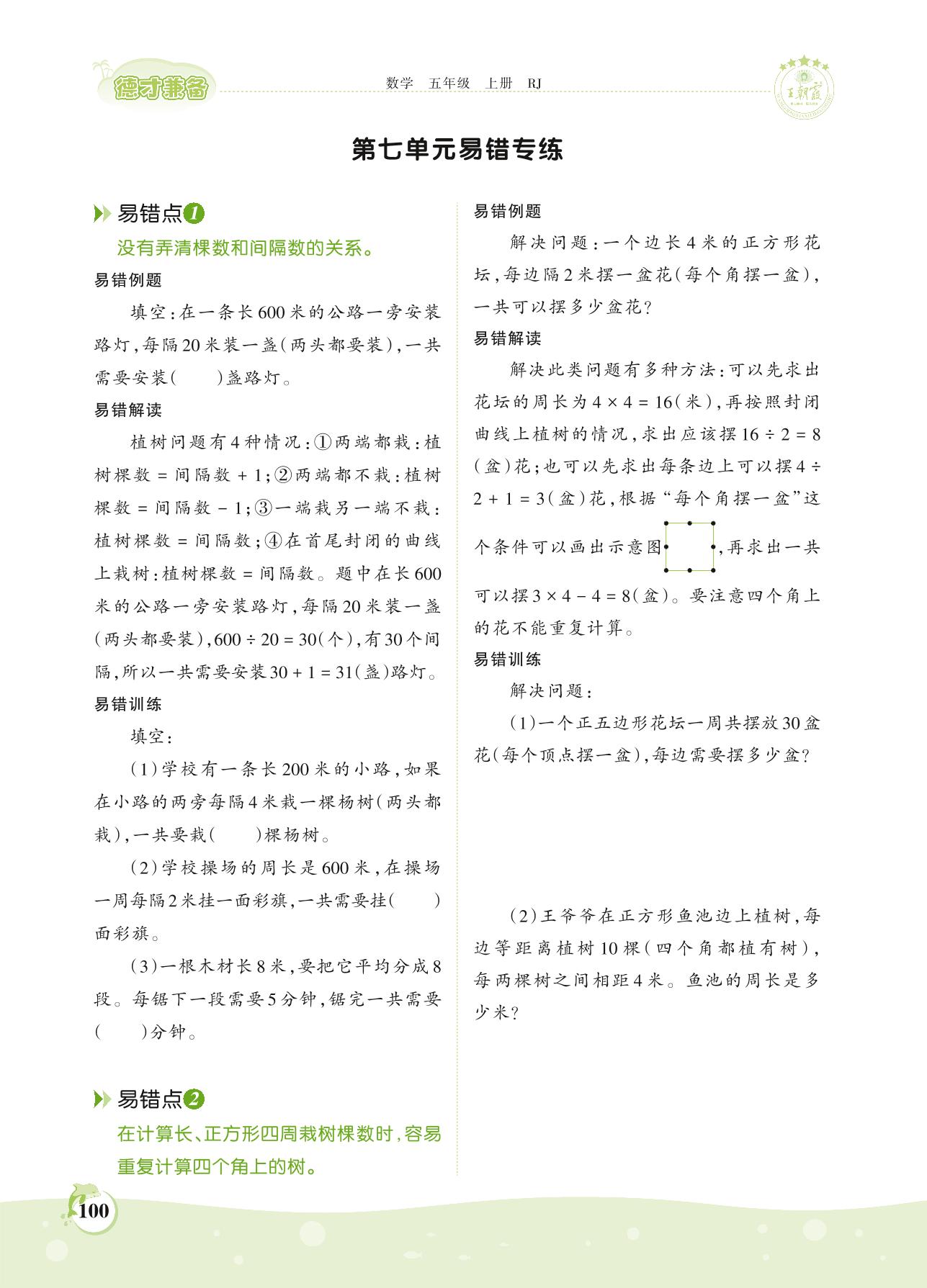 2021上册五年级数学人教版 第七单元 数学广角 植树问题——第七单元易错专练