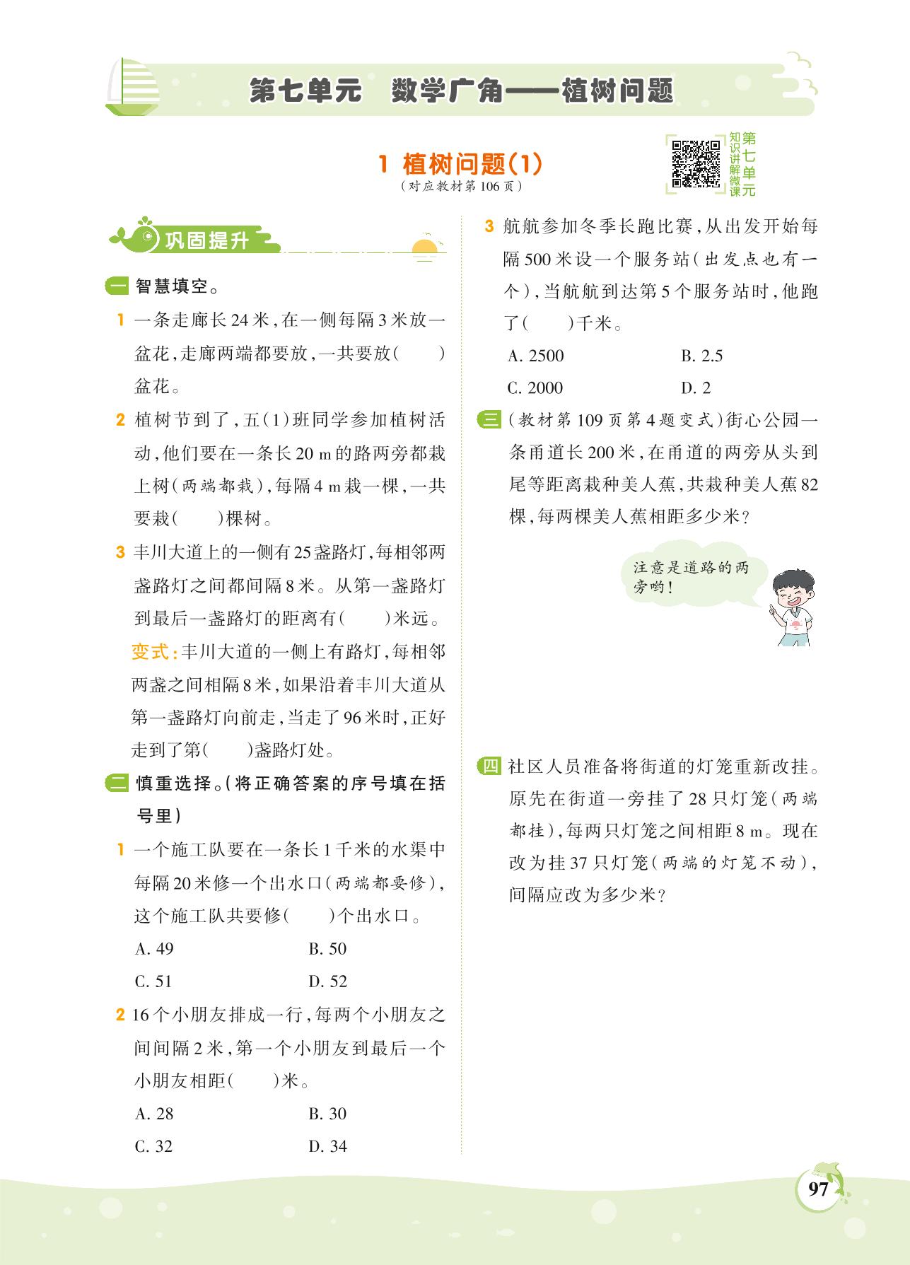 2021上册五年级数学人教版 第七单元 数学广角 植树问题——1 植树问题(1)