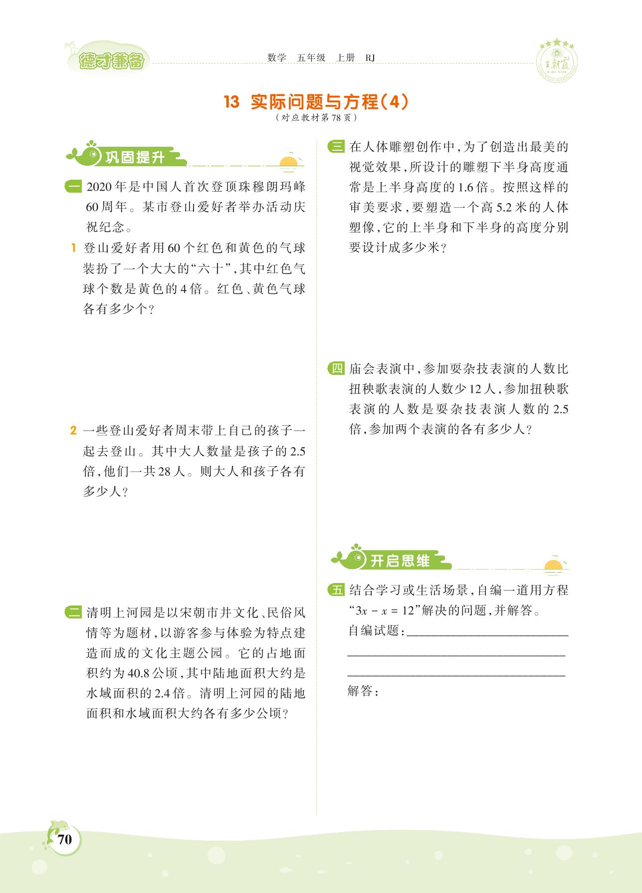 2021上册五年级数学人教版 第五单元 简易方程——13 实际问题与方程(4)