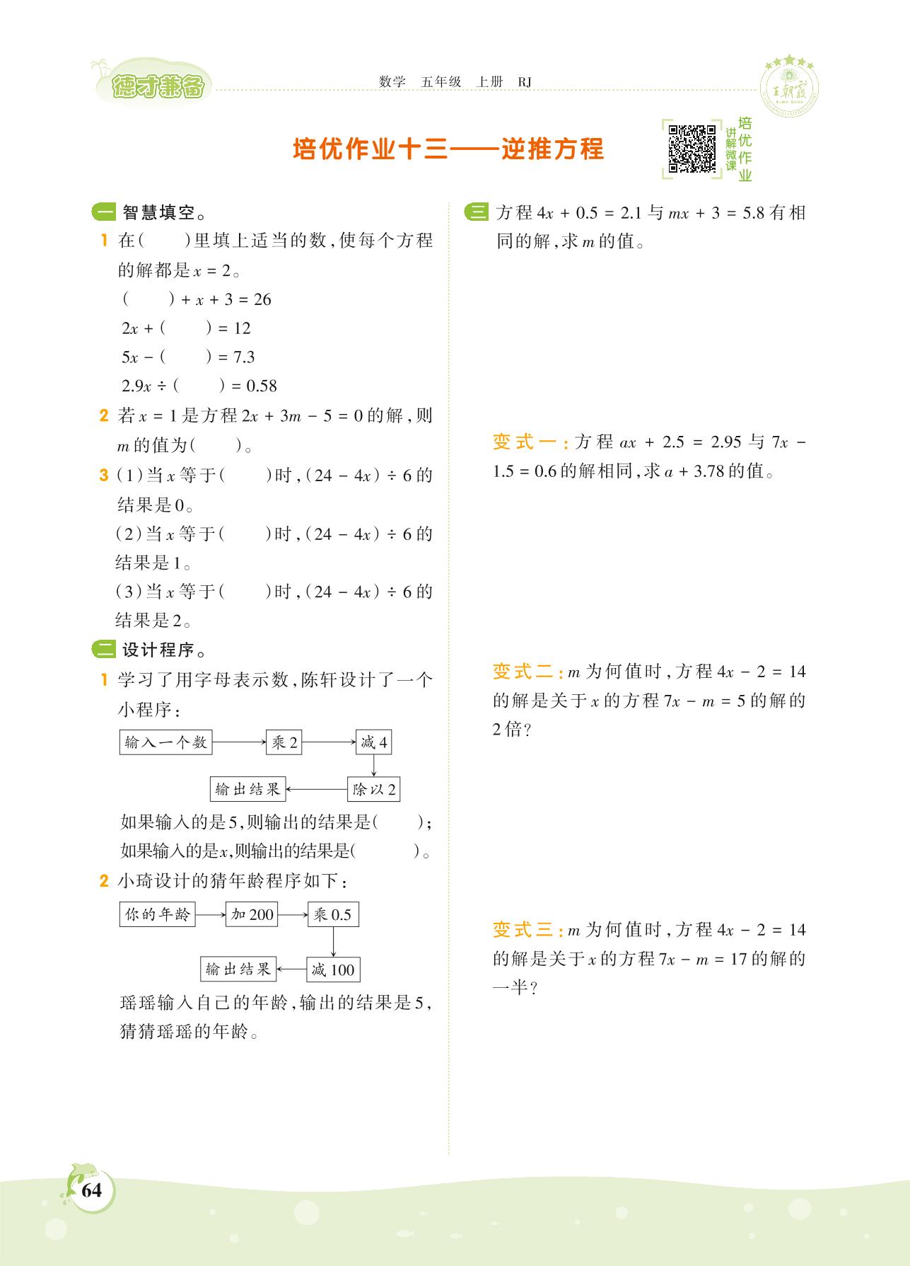 2021上册五年级数学人教版 第五单元 简易方程——培优作业十三 逆推方程