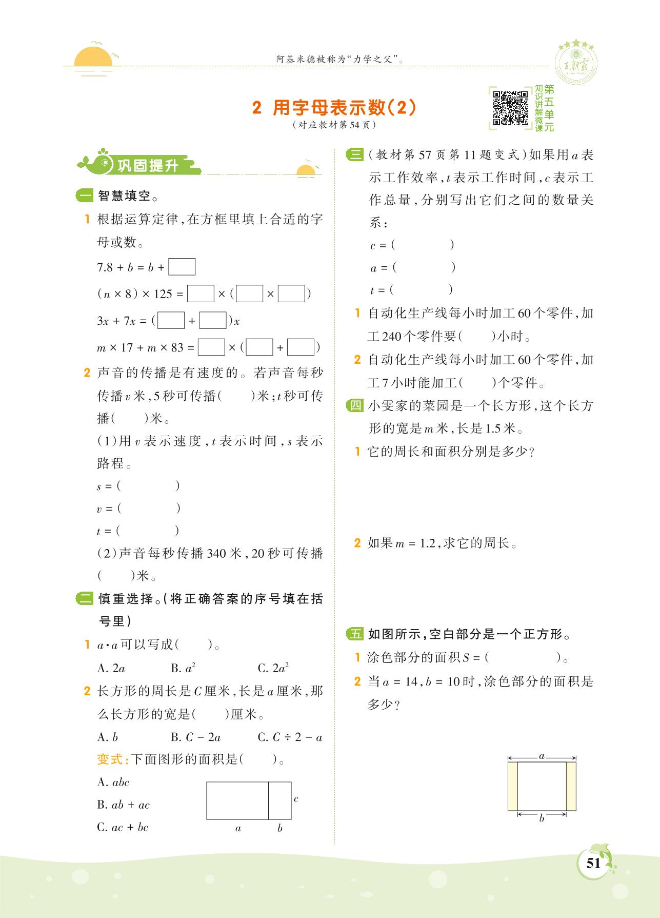 2021上册五年级数学人教版 第五单元 简易方程——2 用字母表示数(2)