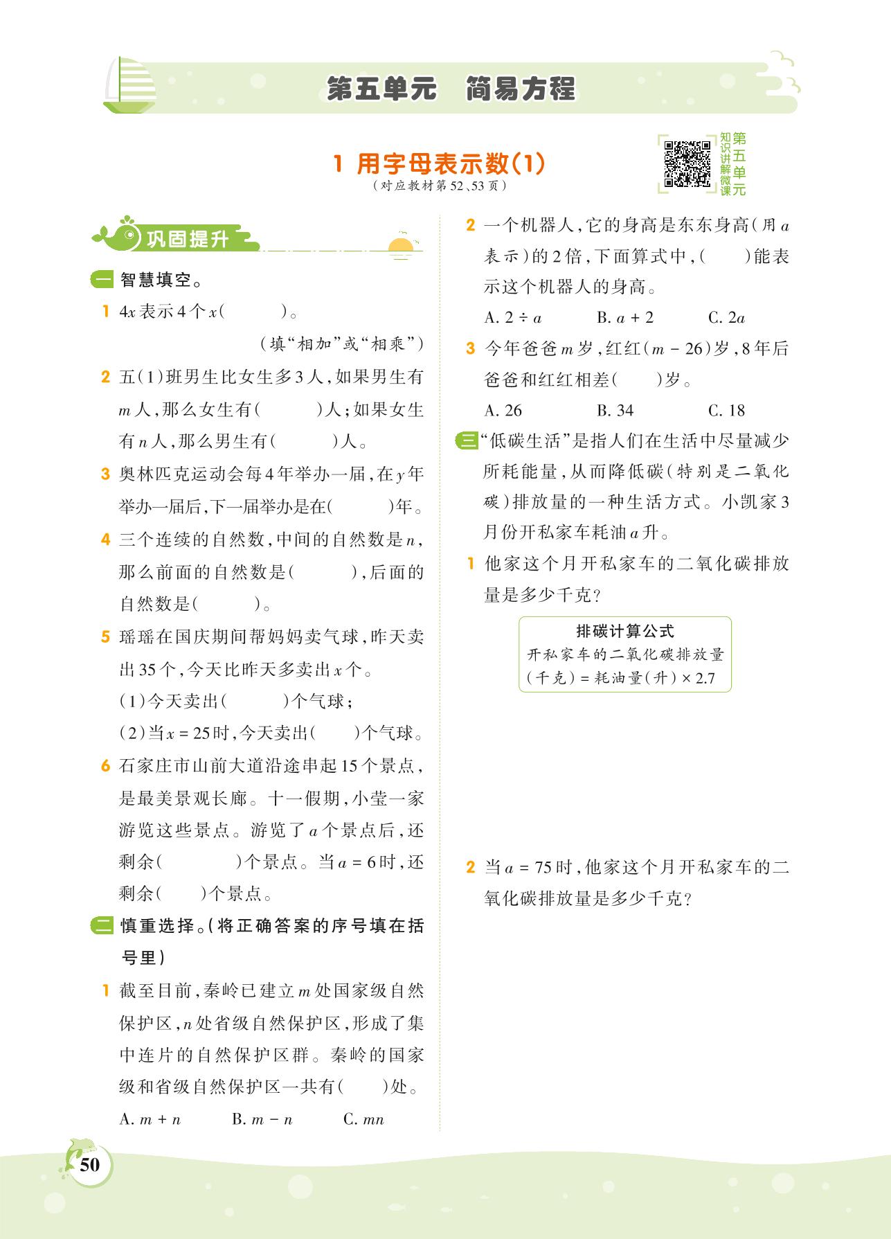 2021上册五年级数学人教版 第五单元 简易方程——1 用字母表示数(1)