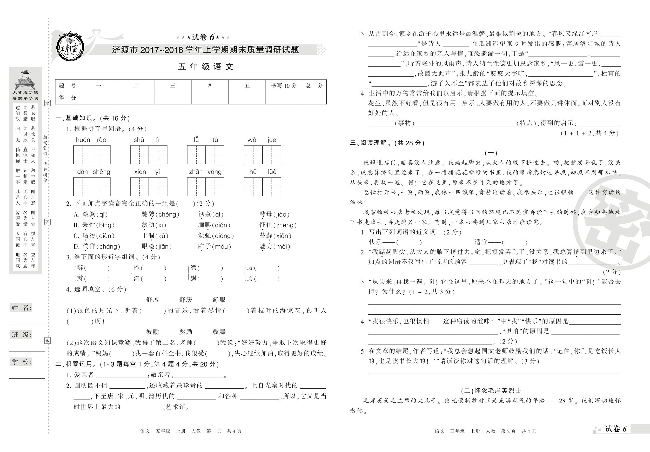 2017-2018学年第一学期济源市五年级语文试卷(人教版)【6】