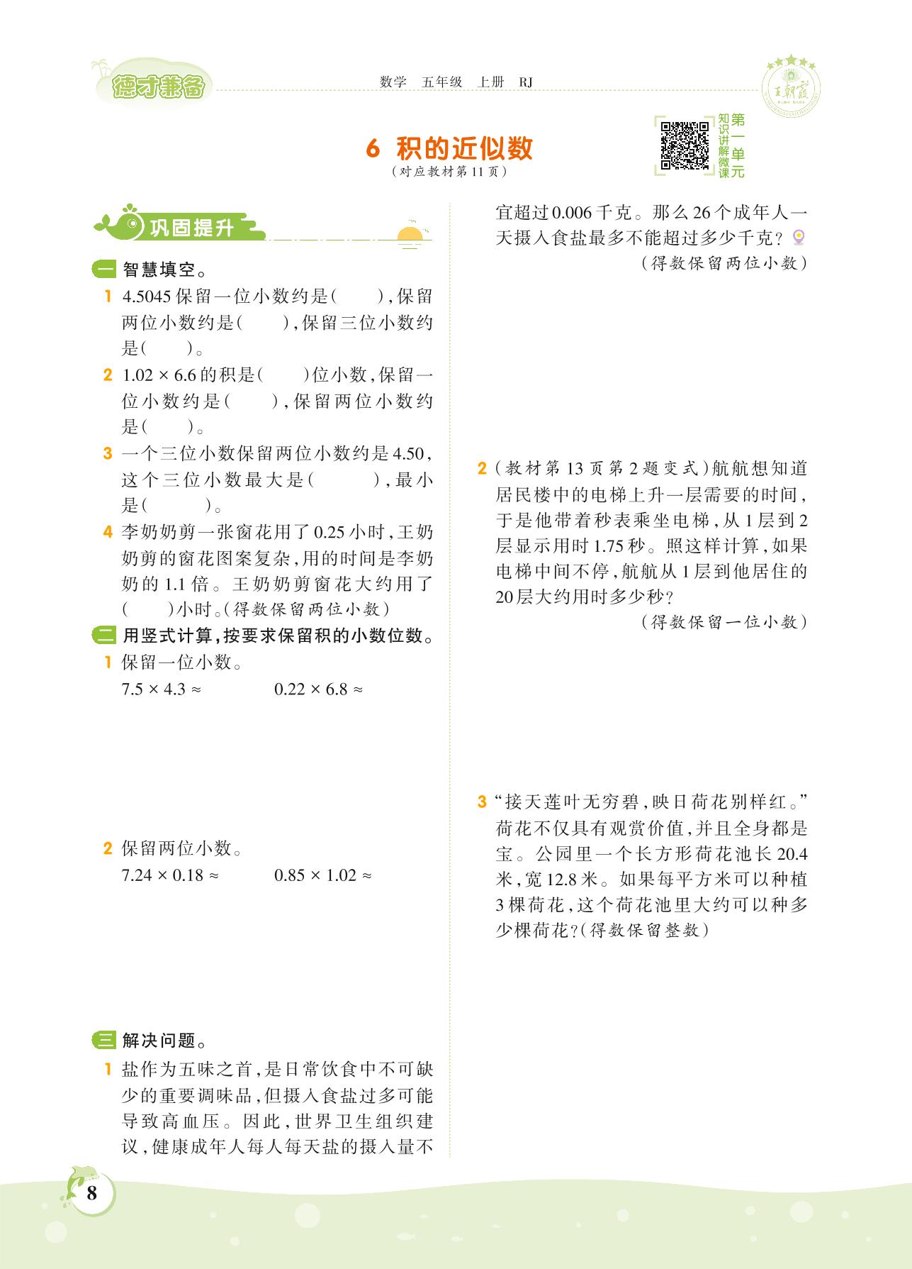 2021上册五年级数学人教版 第一单元 小数乘法——6 积的近似数