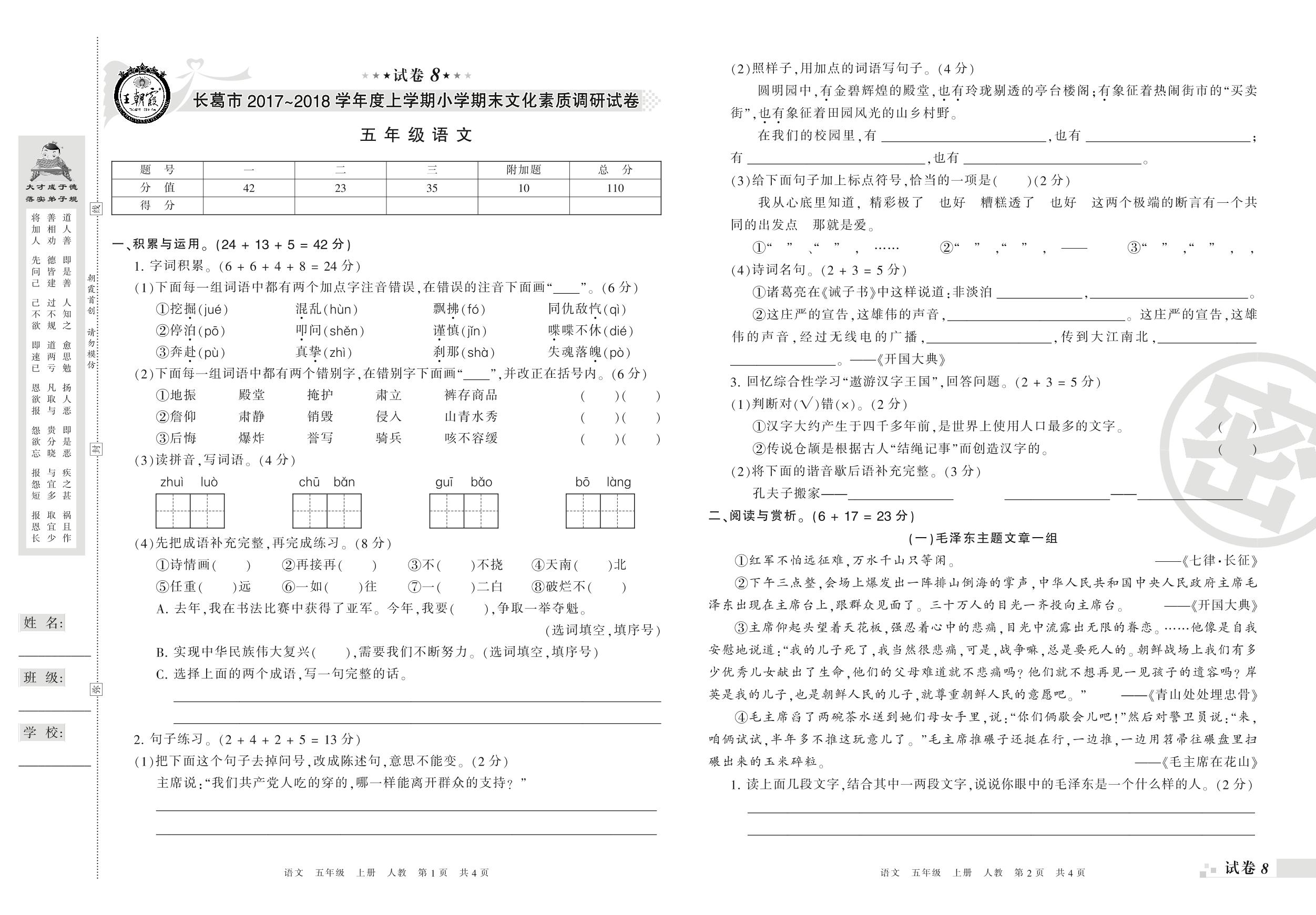 2017-2018学年第一学期长葛市五年级语文试卷(人教版)【8】