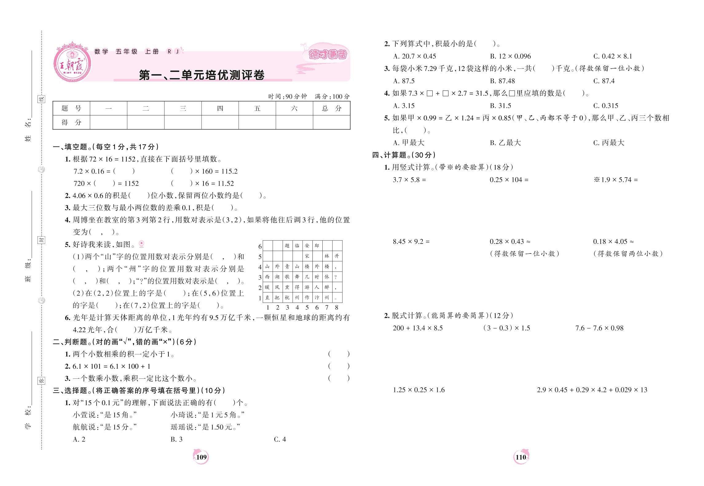 2021上册五年级数学人教版 第一、二单元培优测评卷