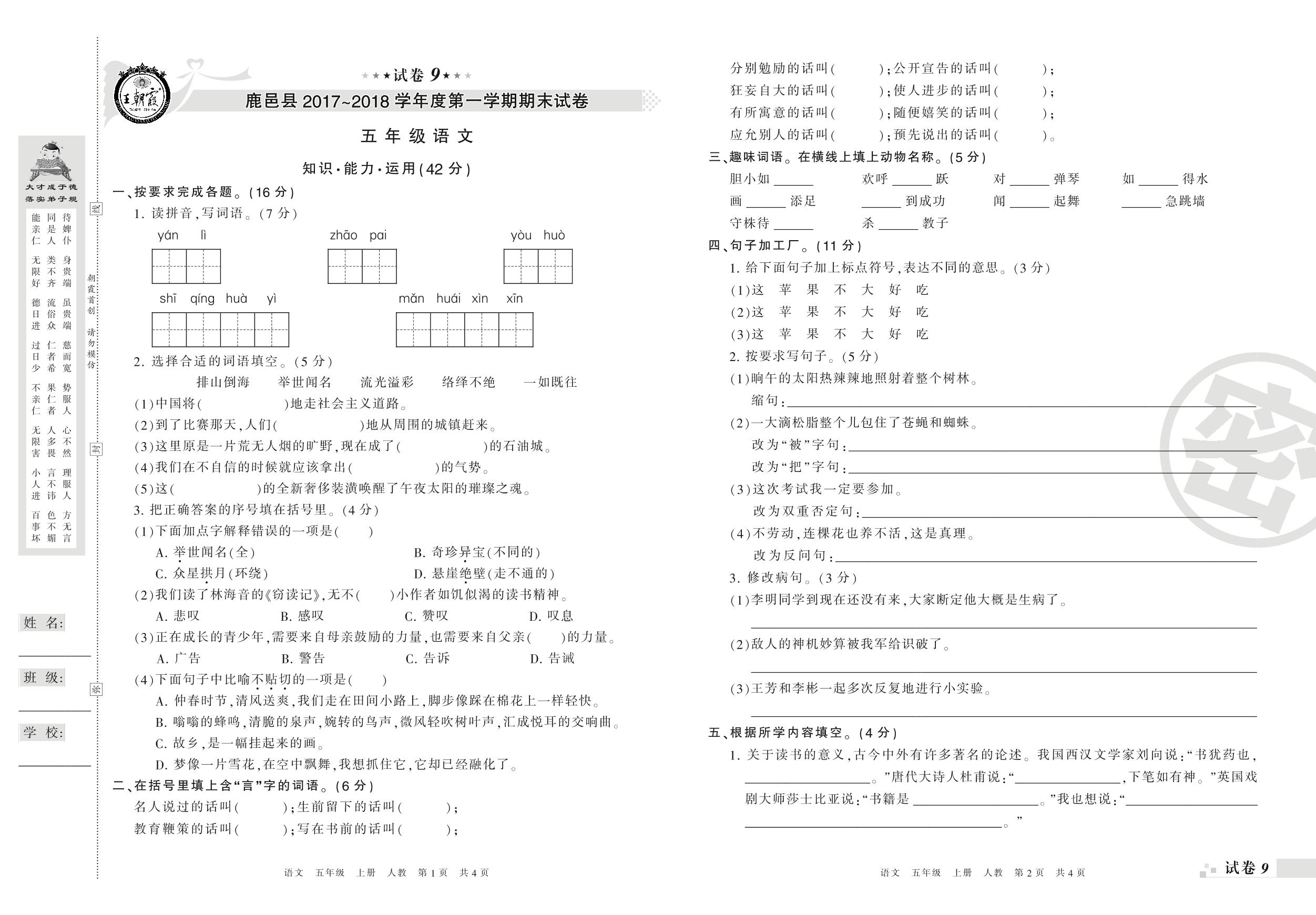 2017-2018学年第一学期周口市鹿邑县五年级语文试卷(人教版)【9】