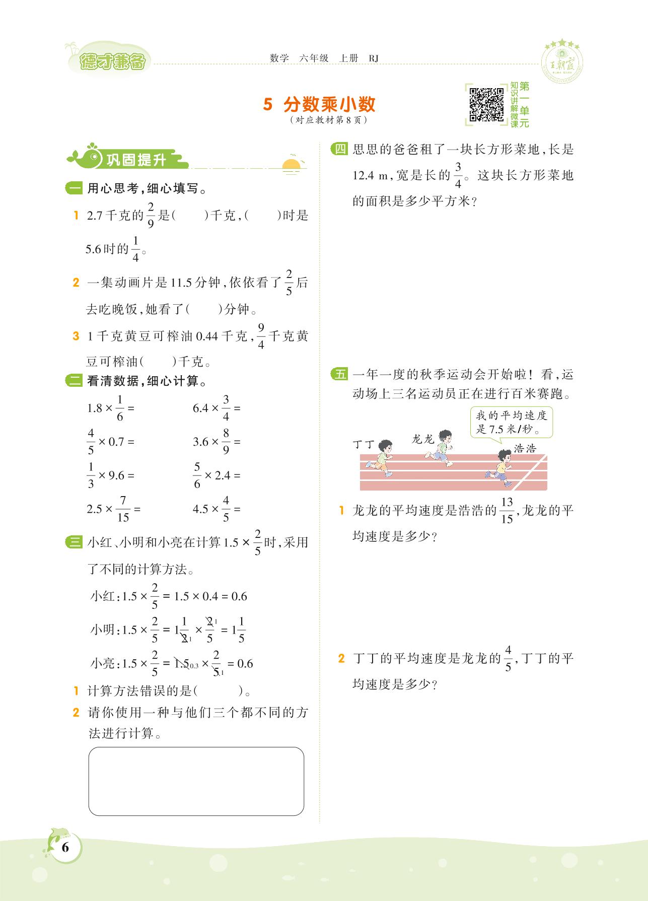 2021上册六年级数学人教版 第一单元 分数乘法——5 分数乘小数