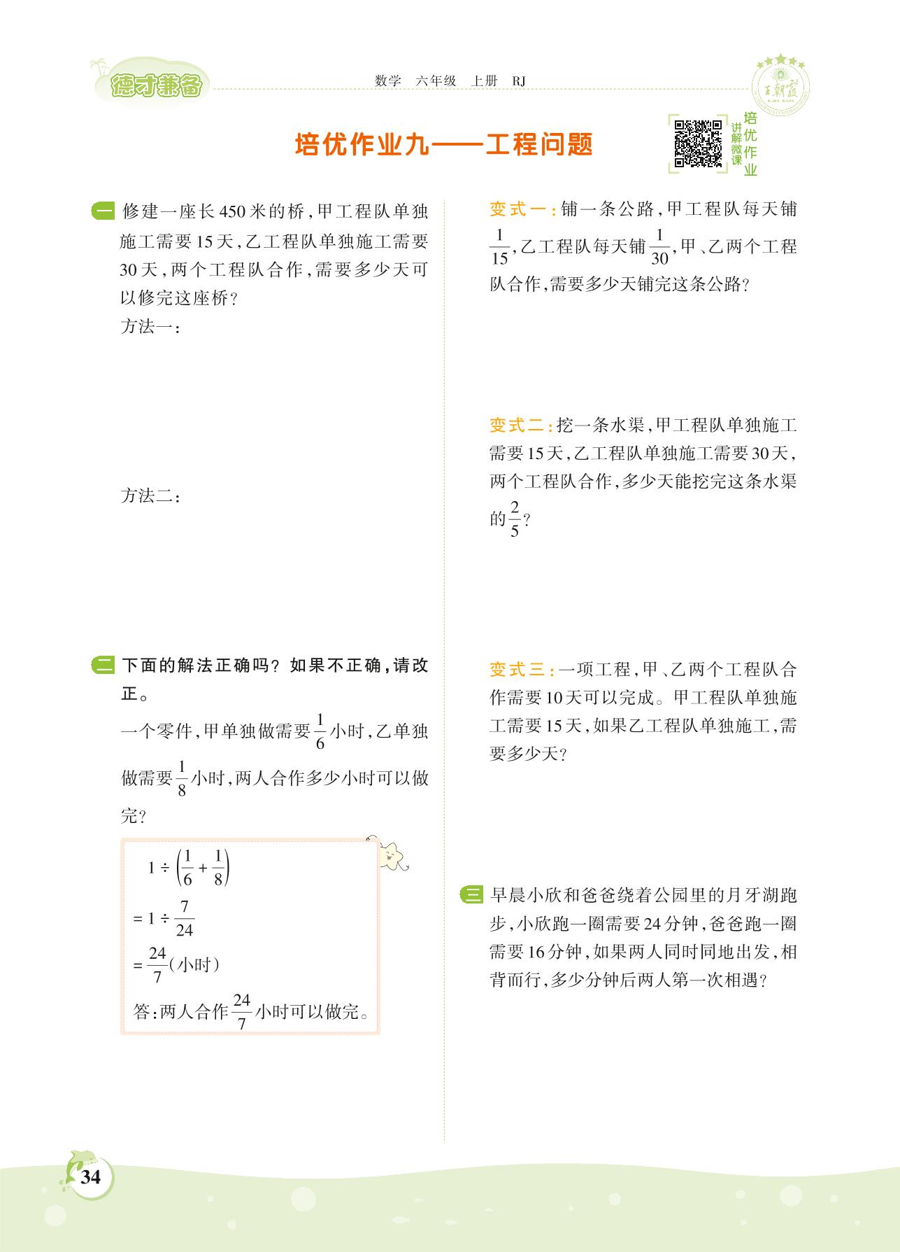 2021上册六年级数学人教版 第三单元 分数除法——培优作业九 工程问题