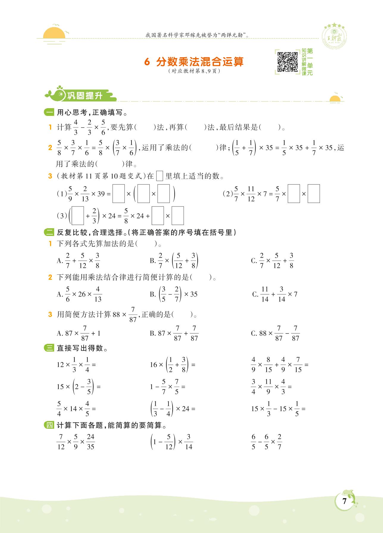 2021上册六年级数学人教版 第一单元 分数乘法——6 分数乘法混合运算