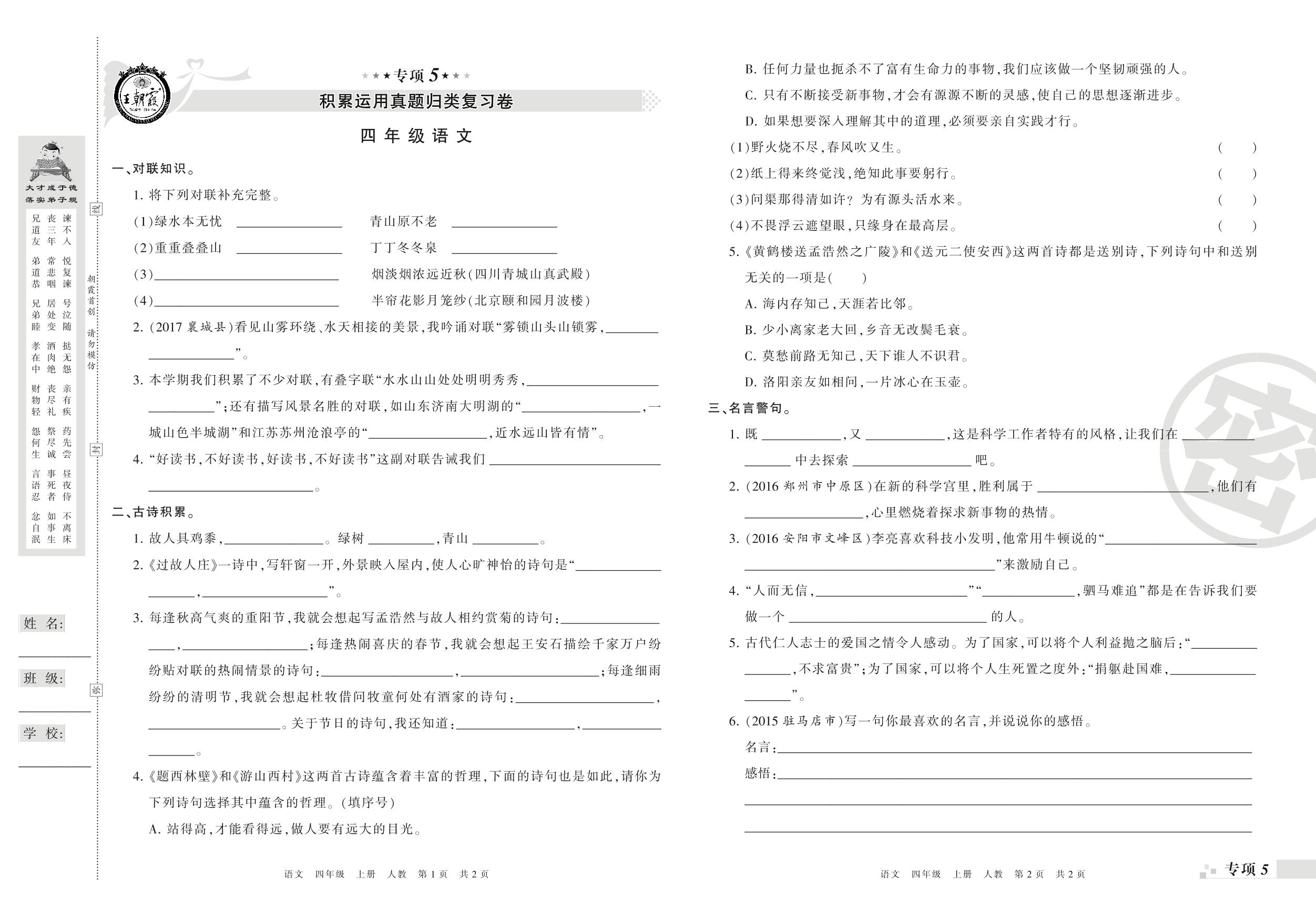 王朝霞期末专项卷——积累运用、课内阅读真题归类复习四年级上册语文(人教版)_R210801223239【0】