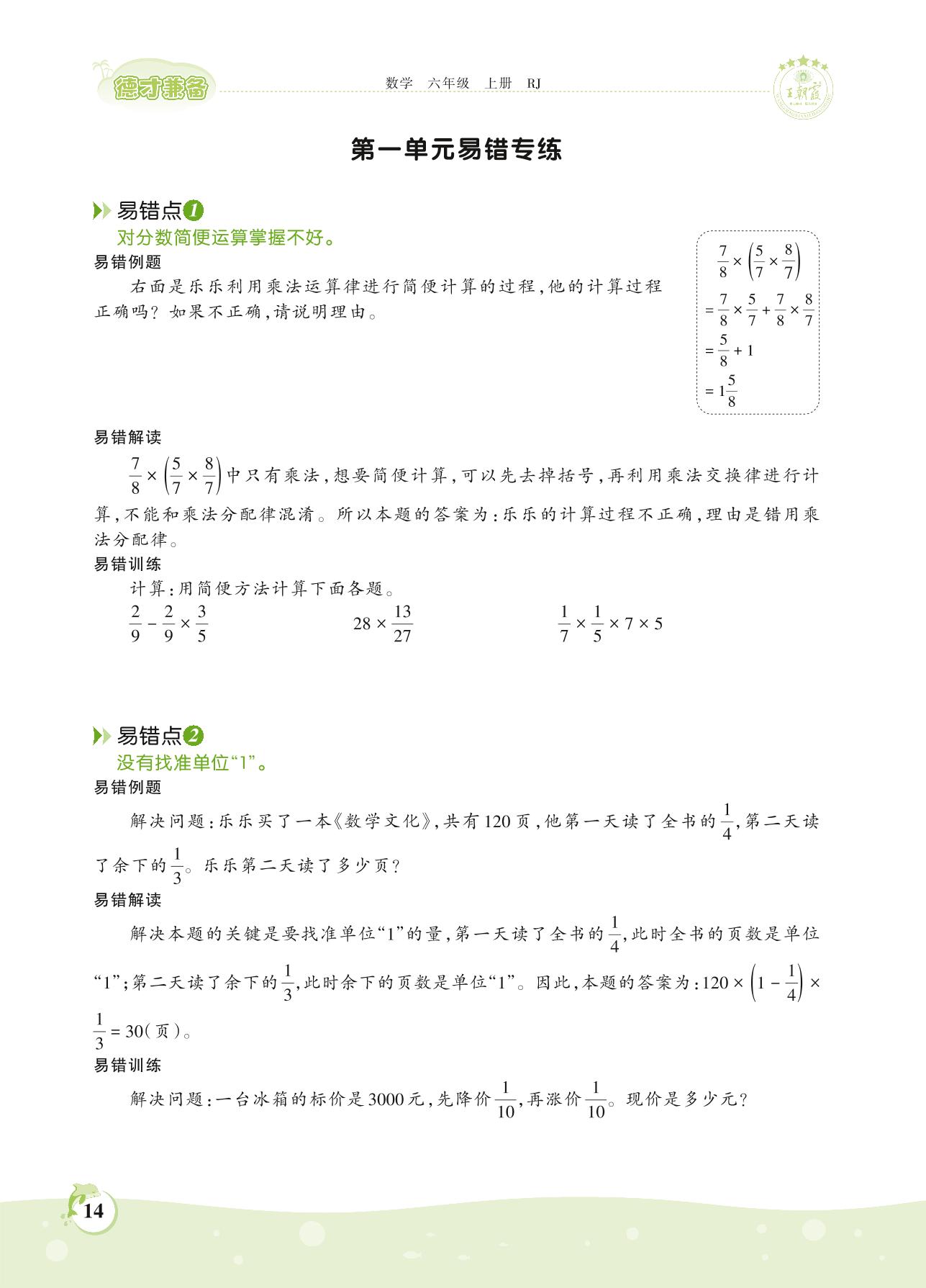 2021上册六年级数学人教版 第一单元 分数乘法——第一单元易错专练