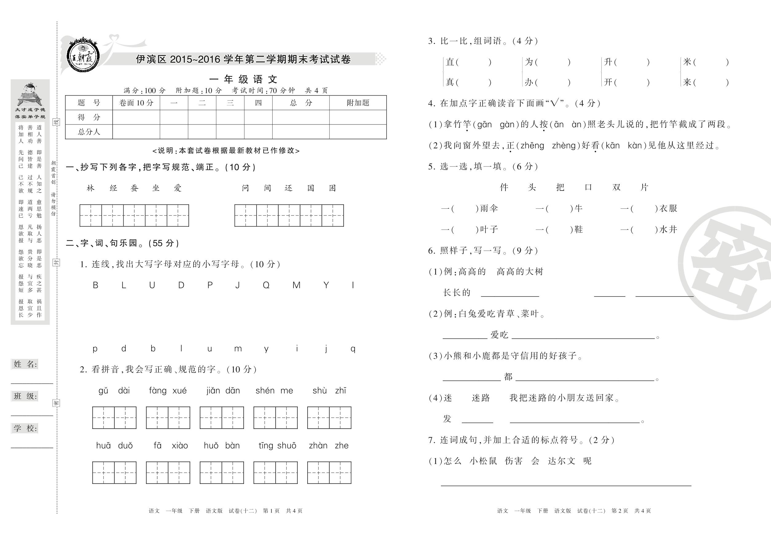 2015-2016学年第二学期洛阳市伊滨区一年级语文试卷(语文版)【12】